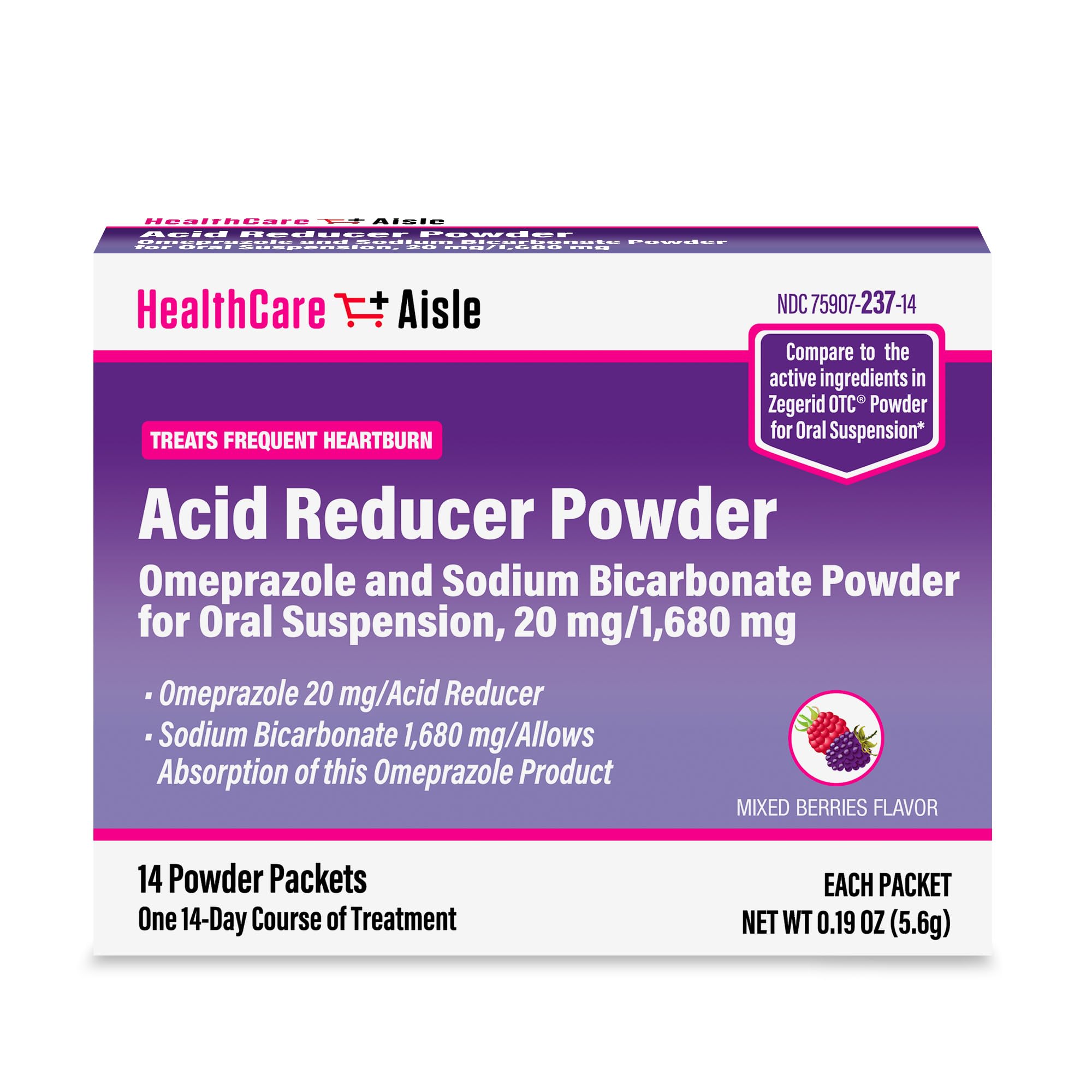 Treats Frequent Heartburn. Omeprazole 20mg Acid Reducer. Sodium Bicarbonate 1,680 mg Allows faster absorption of this Omeprazole Product. Compare to the active ingredient in Zegerid OTC Powder for Oral Suspension. Mixed Berry Flavor