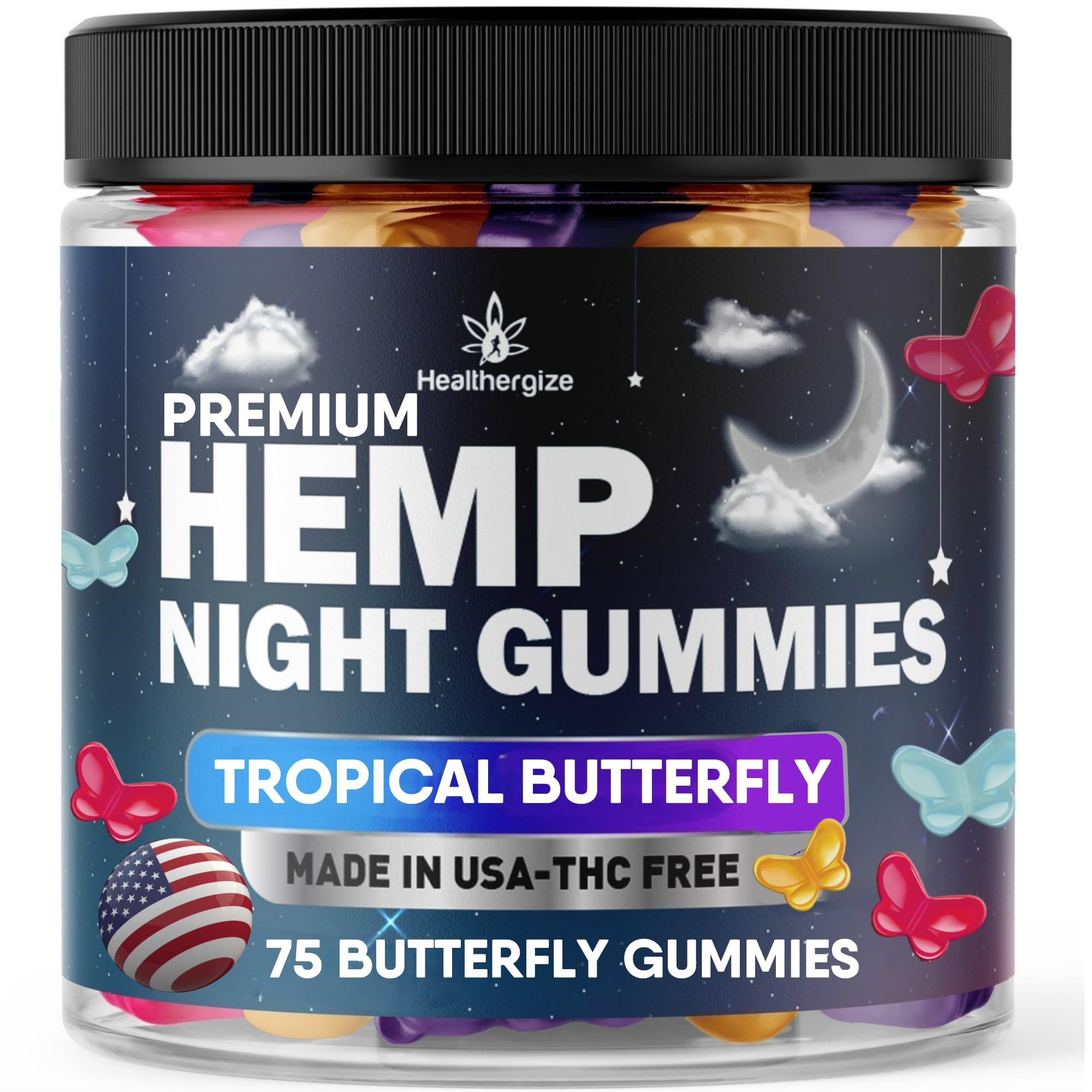 Healthergize Hemp Gummies Night Time, High Potency Nap Gummies, Peace and Relaxation, Fruity Butterfly Gummy Bear Edibles, Good Mood, Calm, Restful Bedtime-Natural Omega Hemp Oil-Made in USA