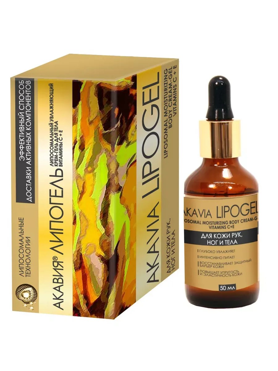 AKAVIA LIPOGEL LIPOSOMAL MOISTURIZING BODY CREAM-GEL. VITAMINS C + E» Appearance: Gel-like texture from transparent to light yellow color Main active ingredients: Vitamin E, vitamin C, sodium alginate. Special features: Does not contain mineral oil, silicone, alcohol. Competitive advantages: Liposomal technology allows delivering active substances (vitamin E, vitamin C) to the deep layers of the skin, overcoming the epidermal barrier. Therapeutic and prophylactic properties: Liposomal cream-gel ACAVIA LIPOGEL intensively moisturizes, smoothes and restores the skin. The active components of the serum-gel are inside hollow microcapsules - liposomes, the shell of which consists of phospholipids of plant origin. Their unique structure and size allow liposomes to penetrate the epidermal barrier and deliver active ingredients into the dermal layer of the skin. Phospholipids strengthen and restore cell membranes, increase epidermal elasticity, and enhance the skin's protective function. Antioxidant vitamins C and E protect cell membranes from free radical damage and prolong the skin's youthful appearance. Vitamin E moisturizes and nourishes, reduces dryness and flaking, and accelerates cell renewal. Vitamin C stimulates collagen and elastin production, restores natural radiance, and reduces skin pigmentation. Moisturizing ingredients and vitamins prevent moisture loss, protect the skin from dryness, saturate it with nutrients, and leave it soft, smooth, and nourished. AKAVIA LIPOGEL cream-gel has a light texture and is quickly absorbed upon application, leaving no greasy or sticky feeling.
