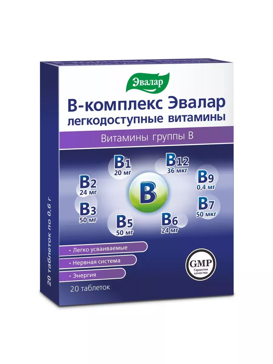В-комплекс Эвалар легкодоступные витамины содержит новые легко усваиваемые формы витаминов группы В и способствует: -восстановлению поврежденных нервных волокон и уменьшению болевых ощущений; -улучшению функционального состояния центральной и периферической нервной системы.