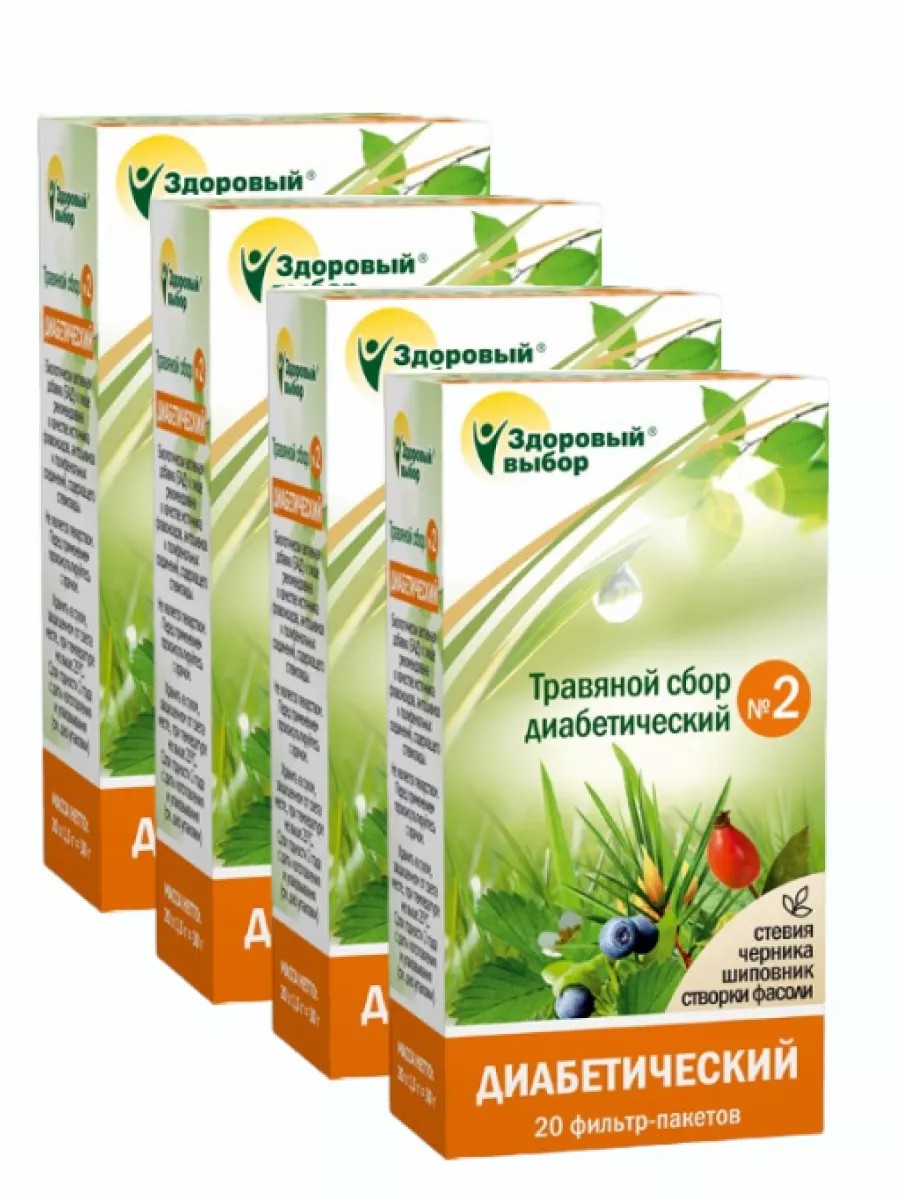 Биологически активная добавка (БАД) к пище «Травяной сбор Здоровый Выбор №2 «Диабетический» рекомендована в качестве источника флавоноидов, полифенольных соединений и антоцианов, содержащего стевиозиды и применяется при сахарном диабете. Способствует снижению уровня сахара в крови, оказывает благоприятное воздействие на углеводный обмен, способствует нормализации обмена веществ при сахарном диабете 2 типа.
