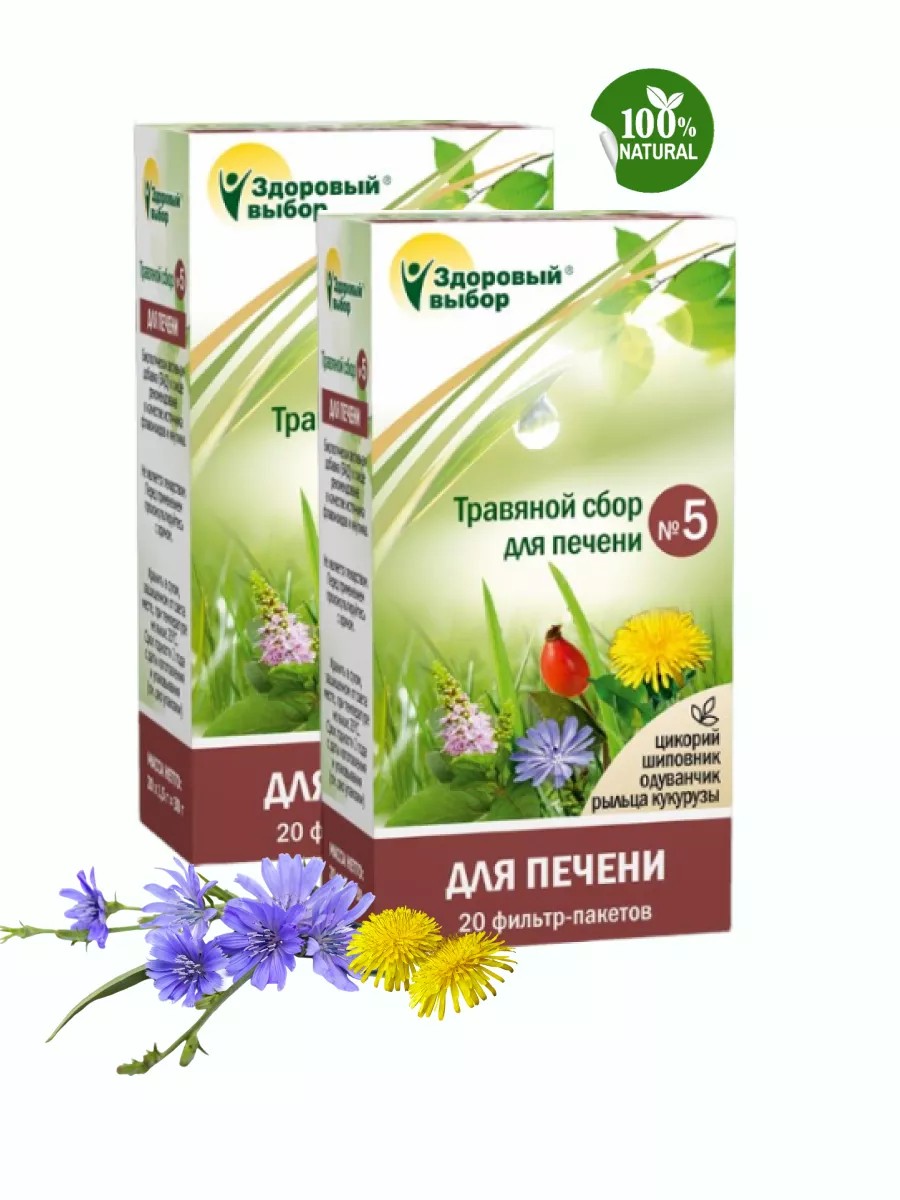 Биологически активная добавка (БАД) к пище «Травяной сбор Здоровый Выбор №5 для печени» рекомендована в качестве источника флавоноидов и инулина. Это набор трав (корни одуванчика, корни цикория, плоды шиповника, столбики с рыльцами кукурузы, листья мяты перечной), который способствует укреплению функций печени и чистке организма от токсинов и шлаков. Обладает мягким желчегонным действием, способствует регенерации клеток печени, улучшает очищающие (метаболические) функции печени.