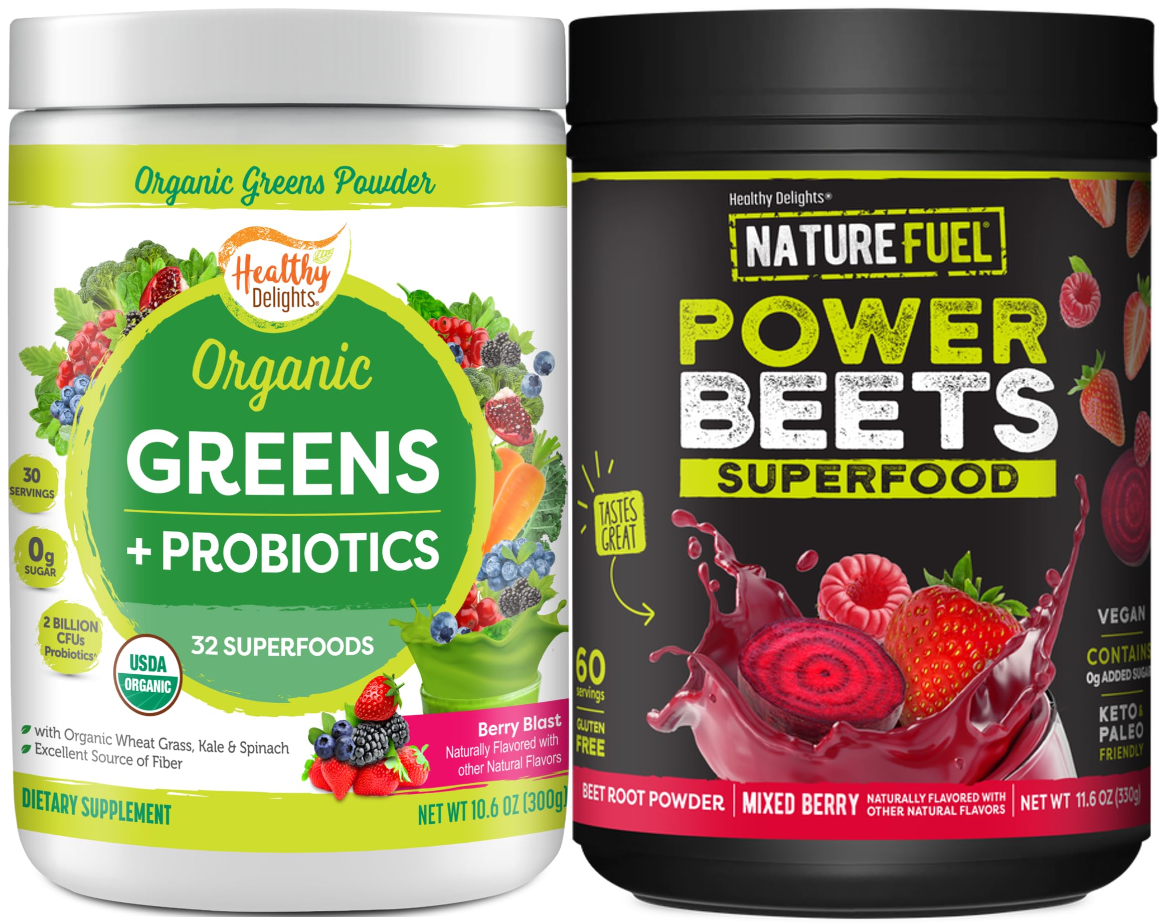 Healthy Delights Bundle Berry Flavor: Nature Fuel Power Beets Powder Natural Energy & Stamina 60 Servings (Packaging May Vary) + Healthy Delights - Naturally Boost Energy USDA Organic 30 Servings