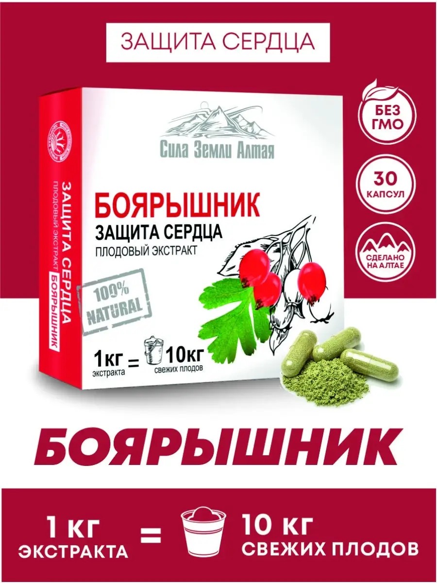 Экстракт боярышника витамины для сердца и сосудов серии Сила земли Алтая - это натуральный продукт являющийся концентрированной вытяжкой из плодов боярышника, который рекомендуется при заболеваниях нервной системы, а также для сердца и сосудов. Боярышник содержит витамин е, витамин c, витамин к, про витамин а (каротин), макро- и микроэлементы Ca кальций, Mg магний, K калий, Zn цинк. Витамины для сердца на основе боярышника укрепляют капилляры, препятствуют тромбообразованию, снижают повышенное давление крови, снимают раздражительность и неврозы, регулируют сердечный ритм и улучшают сон. Благодаря совокупному действию биологически активных веществ, боярышник способствует укреплению и питанию сердца, поддерживая его ритм и работу. Улучшает состояние кровеносных сосудов, нормализует уровень холестерина в крови, рекомендуется для восстановления сердечной мышцы и коронарного кровообращения. Обладает легким тонизирующим действием. Основными действующими веществами боярышника являются флавоноиды: кверцитин, витексин, гиперозид, органические кислоты: олеаноловая, кофейная, урсоловая. Боярышник – обладает кардиотоническим действием, усиливает сокращения миокарда и уменьшает возбудимость. Тритерпеновые кислоты усиливают кровообращение в сердечных сосудах и сосудах мозга, повышают чувствительность сердечной мышцы к действию сердечных гликозидов, устраняют боли в области сердца. Применяют при функциональных расстройствах сердечной деятельности, , гипертонической болезни, астеноневротических состояниях. Боярышник нормализует показатели свертываемости крови, уровень холестерина, предотвращает образование атеросклеротических бляшек. Его применяют в случае спазма сосудов. Оказывает седативное (успокаивающее, но без наступления сонливости) действие, полезное растение снижает возбудимость нервной системы, способствует устранению бессонницы, помогает нормализовать сон. Прием боярышника помогает при гастрите в любой форме, метеоризме, в случае затрудненного пищеварения у детей. Применяется для устранения жидкого стула. Плоды боярышника помогают справиться с головной болью, головокружениями, одышкой. Оказываемое антиоксидантное действие препятствует образованию опухолей различной природы, повышает иммунитет, помогает быстрее восстановить силы после перенесенных инфекционных заболеваний. Способ применения: по 1 капсуле 2 раза в день во время еды. Продолжительность приема — 3-4 недели. Прием можно повторять 2-3 раза в год. Противопоказания: беременность, кормление грудью, индивидуальная непереносимость компонентов.