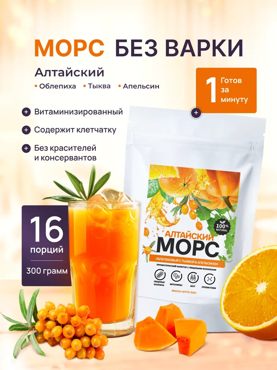 Быстрорастворимый Алтайский морс облепиха, тыква, апельсин и пищевыми волокнами, предоставляет уникальное сочетание пребиотиков и витаминов, способствующих поддержанию здоровья и укреплению иммунной системы. Это отличный выбор для всей семьи, включая детей.