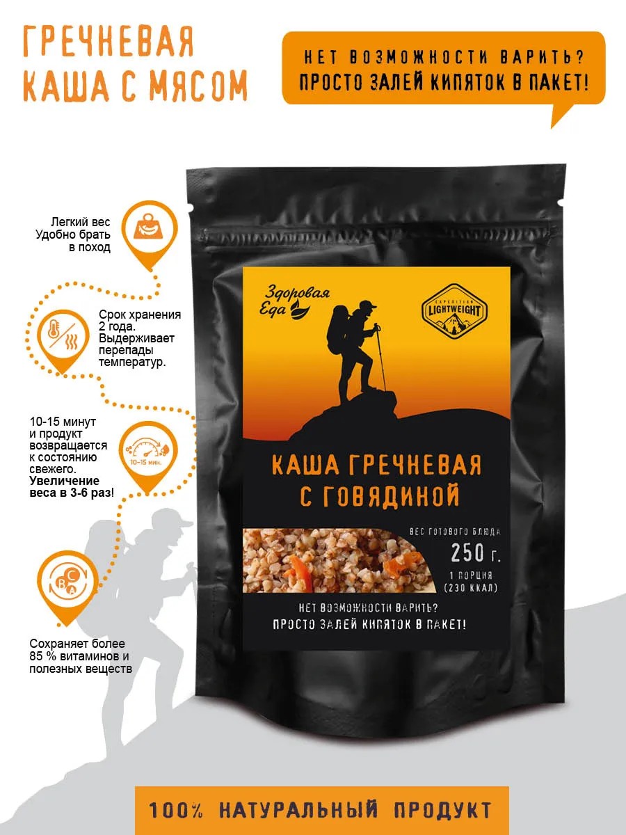 Гречневая каша с говядиной быстрого приготовления в пакетах – это необычная и современная туристическая готовая еда, которая экономит место в рюкзаке и готовится без варки за 7 минут. Благодаря новым технологиям, теперь не обязательно разводить костер и следить, чтобы блюдо в котелке не пригорело. Достаточно залить горячую воду в термоустойчивый порционный пакет, перемешать – и вкусная, полезная гречка на завтрак или обед туриста готова.