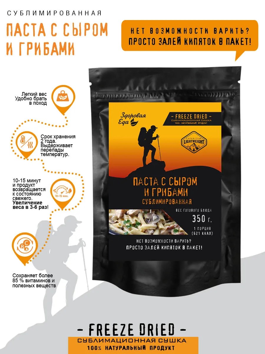 Погрузитесь в мир активного отдыха с удовольствием, благодаря уникальной сублимированной готовой еде без необходимости варки. Макароны с соусом и сыром в порционной упаковке можно взять с собой куда угодно – в поезд, на дачу, в летний лагерь, в поход или автопутешествие. В составе пасты: сублимированные макароны, соус с сыром и грибами, сублимированный сыр.