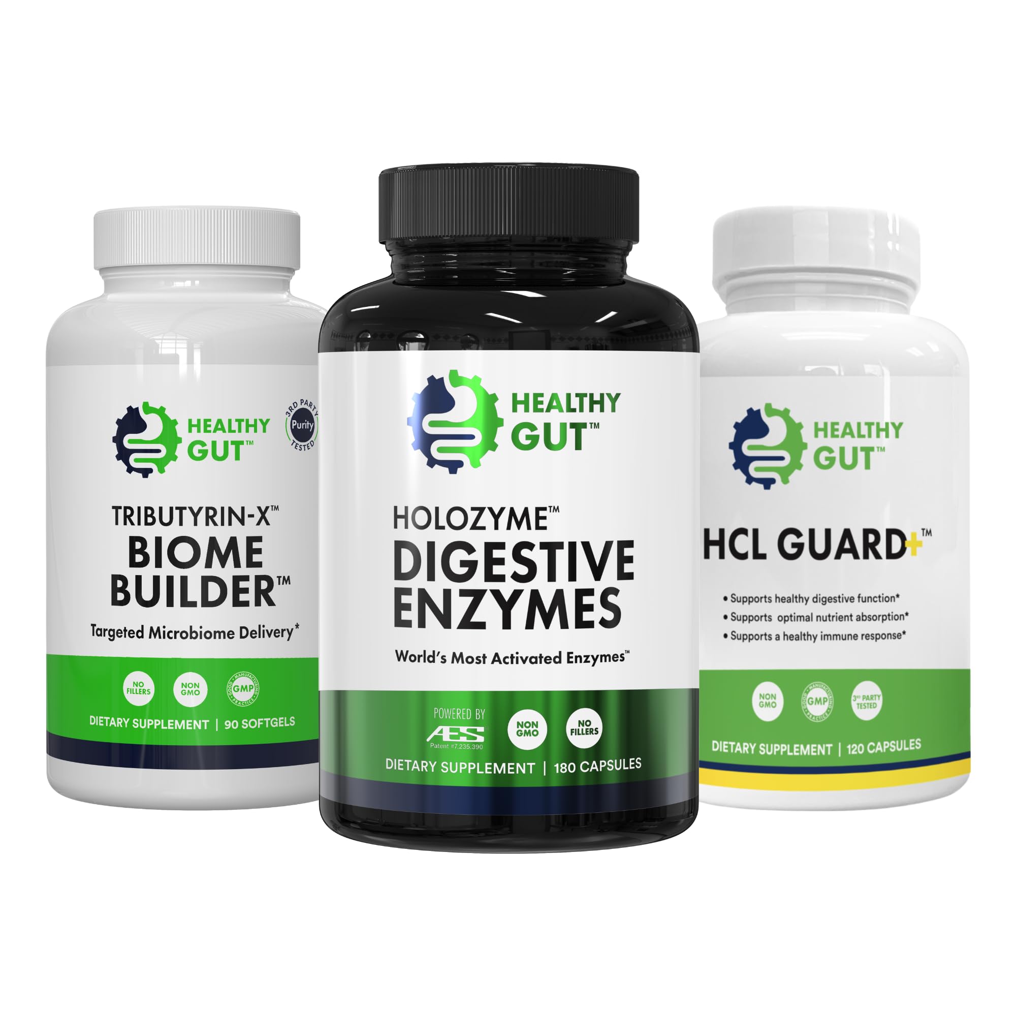 This bundle contains one bottle of HoloZyme, 180 Capsules, one bottle of Tributyrin-X, 90 Softgels, and one bottle of HCL Guard , 120 Capsules.