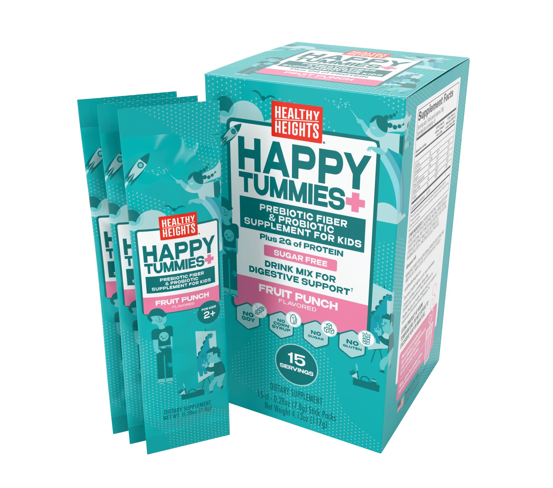 Healthy Heights Happy Tummies Prebiotic and Probiotic Fiber Supplement supports your child's digestive health and wellness with 4 grams of Sunfiber and 2 grams of protein in every serving. Made for children ages 2-13, this dissolvable fruit punch-flavored powder provides gentle, effective support for gut health and regularity. Sunfiber premium soluble fiber, has been clinically shown to improve gut health and aid digestion by promoting the growth of beneficial bacteria, supporting digestive comfort and regularity. Its easy-to-digest formula helps maintain regular bowel movements and a balanced digestive system, ensuring your child feels their best every day. With Happy Tummies, you can provide your child with the nutritional support they need, without any unnecessary additives. Our prebiotic fiber supplement and protein for kids is soy-free, gluten-free, contains no corn syrup, and is low in sugar. Use daily to maintain gut health or as needed to relieve occasional stomach discomforts, like digestive upsets and diarrhea. These ingredients also play a vital role in restoring essential gut flora after antibiotic use, helping balance your child's digestive system. Simply mix a packet of this fruit punch flavored fiber for kids into water, juice, or their favorite drink—or even stir it into plain yogurt or applesauce. Allergens: Milk.Happy Tummies probiotic and prebiotic fiber supplement powder is a delicious and convenient way to support your childs gut health. It's soy-free, gluten-free, contains no corn syrup, and low in sugar!. Happy Tummies also features 5 billion CFUs of probiotic strain and 2 grams of high quality whey protein per serving, to support better gut health, immunity, and a balanced microbiome for your child. With 4 grams of Sunfiber in each serving, this easy to digest soluble fiber supplement powder feeds good bacteria to support your child's digestive health, without causing gas or bloating. Formulated with all-natural, soluble Sunfiber, a prebiotic fiber for kids that promotes digestive wellness, Happy Tummies provides gentle, effective support of your child's gut health and regularity. 1 box of Healthy Heights Happy Tummies Prebiotic Probiotic dissolvable fiber supplement for kids ages 2 , with 2 grams of whey protein, 15 stick packs, 0.28oz each, Fruit Punch flavor.