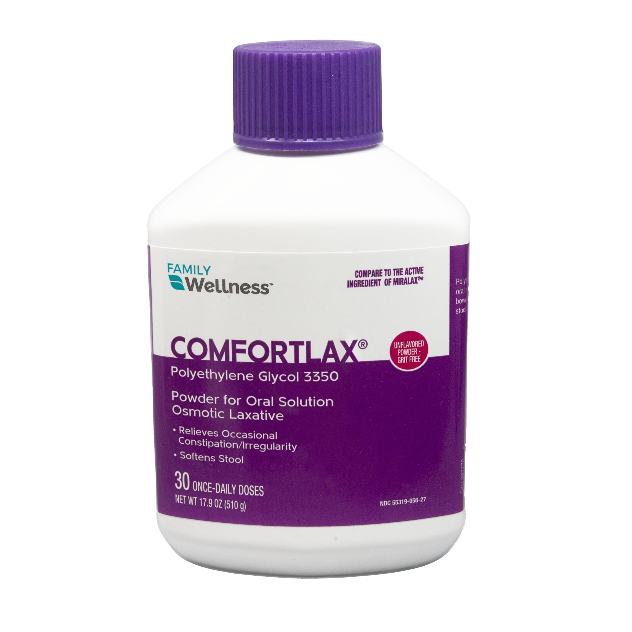 Find gentle and reliable relief with Family Wellness Comfortlax Polyethylene Glycol 3350 Powder for Oral Solution. This unflavored osmotic laxative is specially designed to treat occasional constipation by drawing water into the colon to soften stool and promote a more natural bowel movement. Comfortlax is cramp-free, stimulant-free, and suitable for adults and children over 17 years old. The 17.9 oz bottle provides up to 30 daily doses, making it a convenient and cost-effective solution for irregularity. Mixes easily into your favorite beverage without altering taste or consistency. Whether you're managing travel-related constipation, dietary changes, or just looking for dependable relief, Comfortlax helps you get back to feeling your best—naturally and comfortably.
