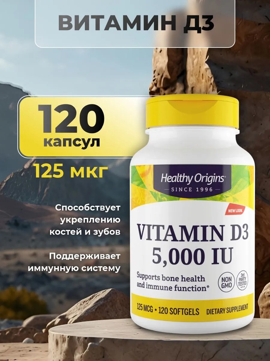 Healthy Origins Витамин D3 5000 мг 120 капсул для мужчин и женщин
