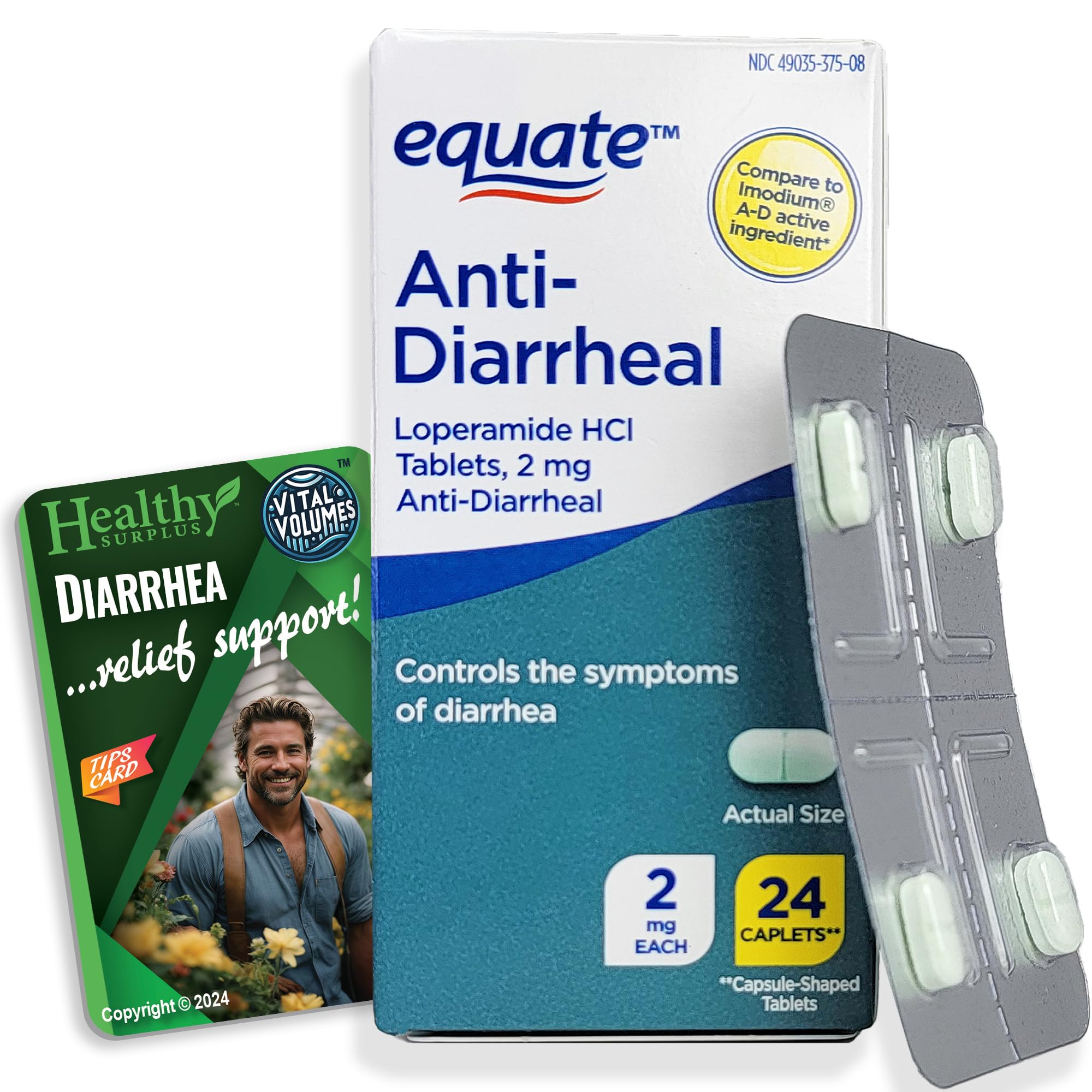 Healthy Surplus Equate Anti-Diarrheal Loperamide HCI 2 mg 24 Caplets and Vital Volumes Tips Card.