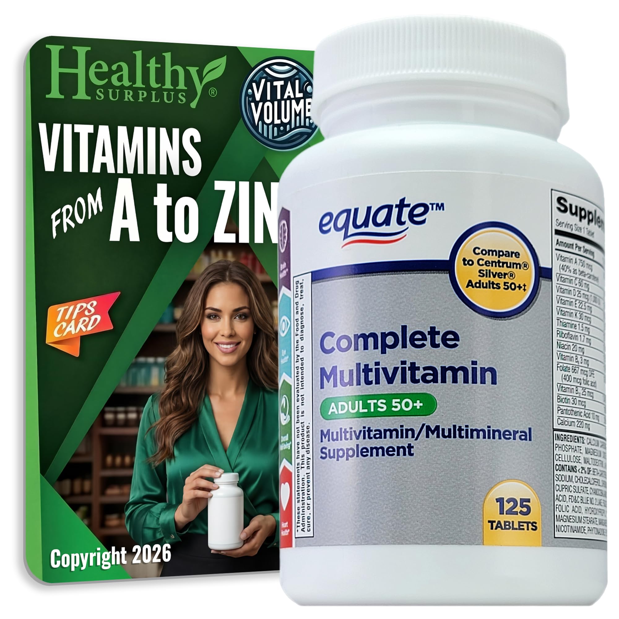 Healthy Surplus Equate Complete Multivitamin Adults 50+ Multimineral 125 Tablets and Vital Volumes Tips Card Bundle