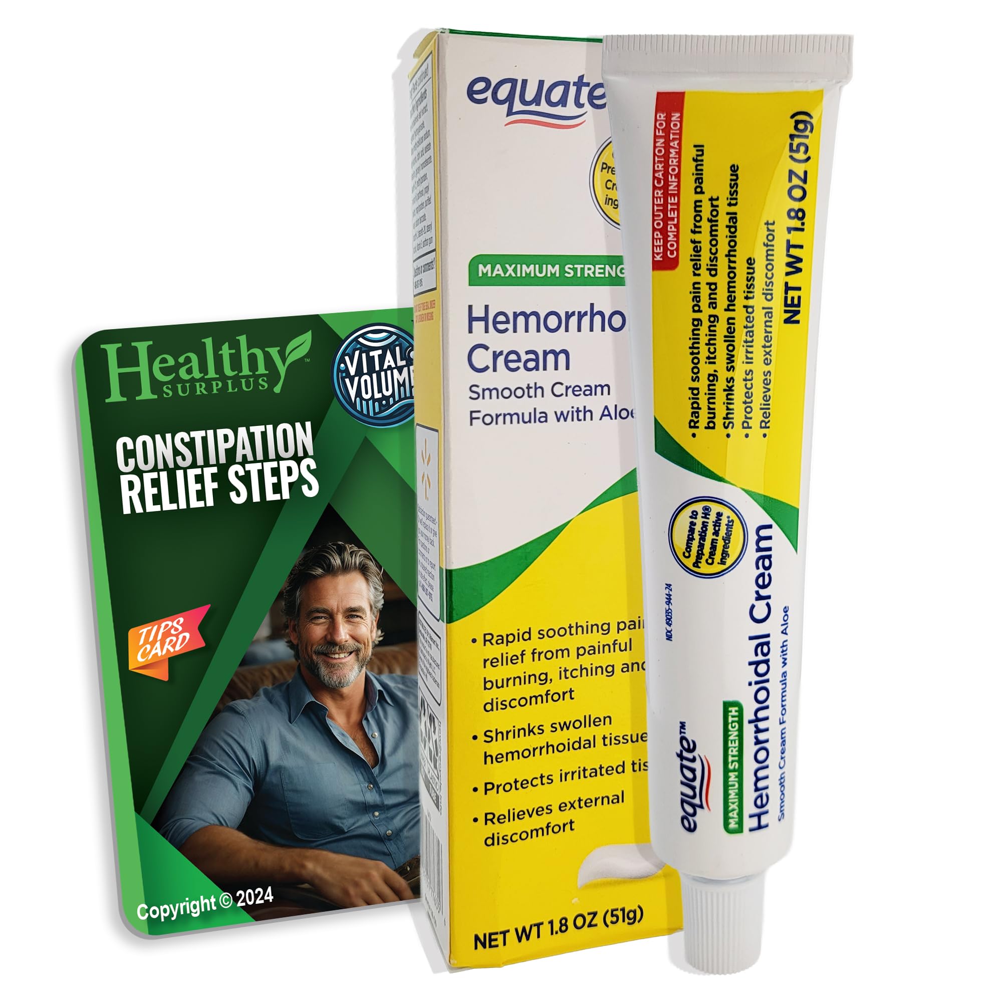 Healthy Surplus Equate Hemorrhoidal Cream/Ointment 1.8 OZ (51g) and Vital Volumes Tips Card Bundle