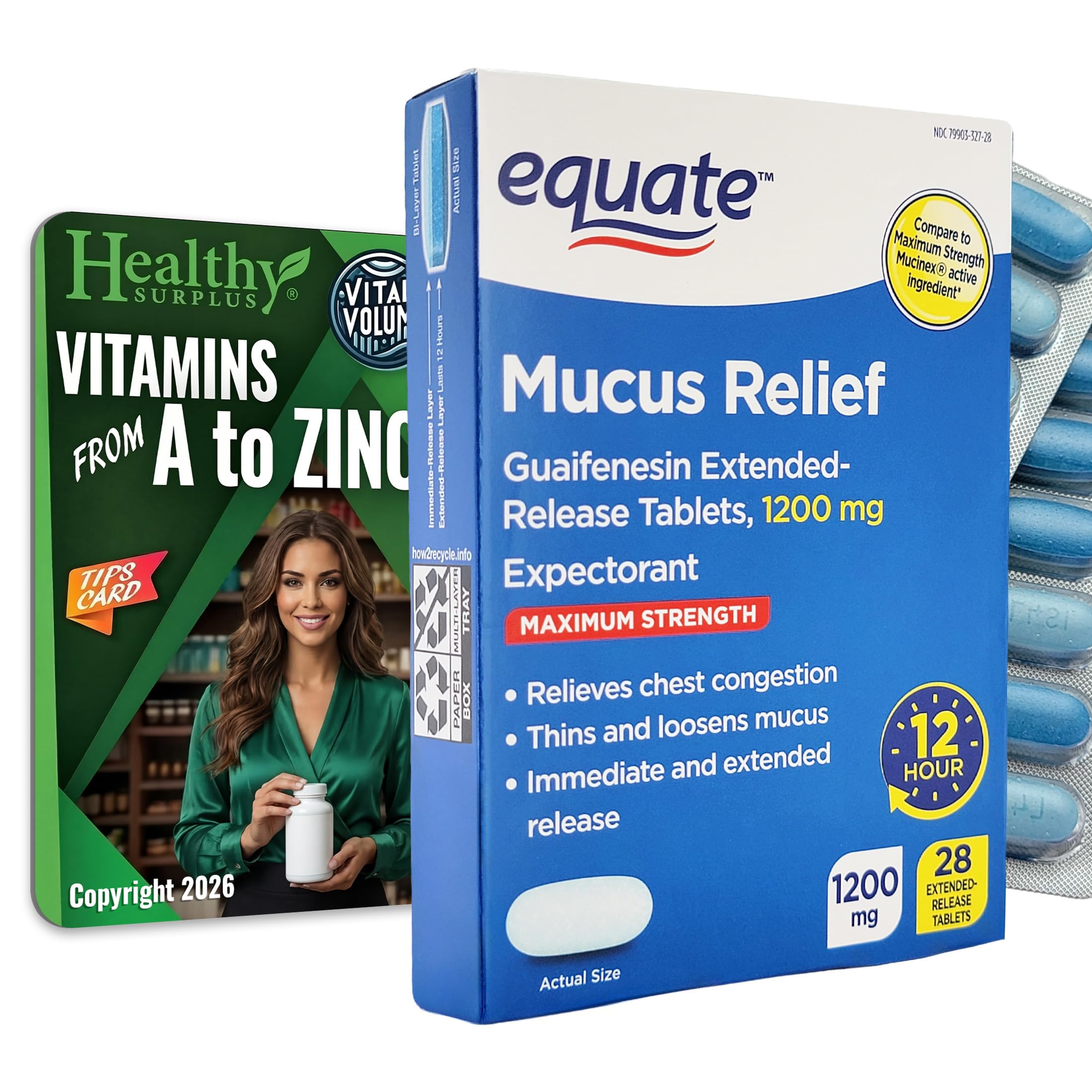 Healthy Surplus Equate Mucus Relief - Guaifensesin Extended-Release - 28 Tablets 1200 mg Expectorant and Vital Volumes Tips Card Bundle