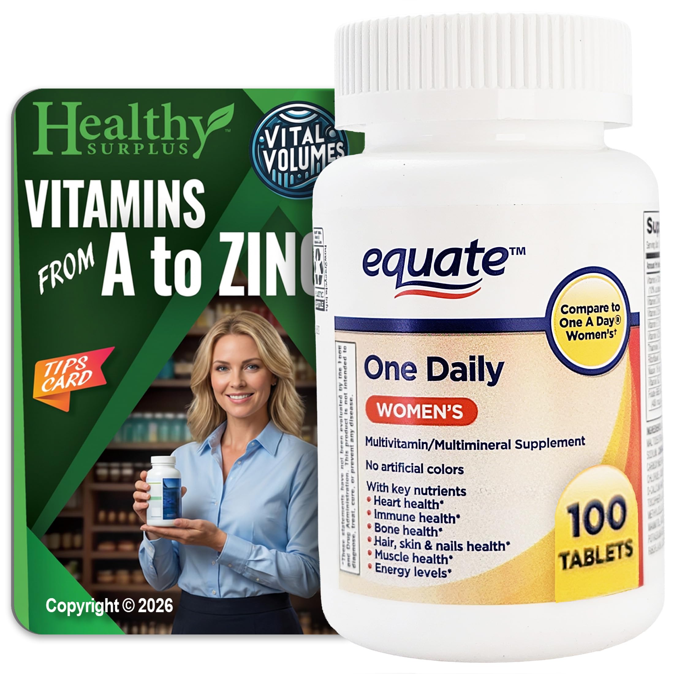 Healthy Surplus Equate One Daily Women's Multivitamin/Multimineral Supplement 100 Tablets and Vital Volumes Vitams from A to Zince Tips Card Bundle