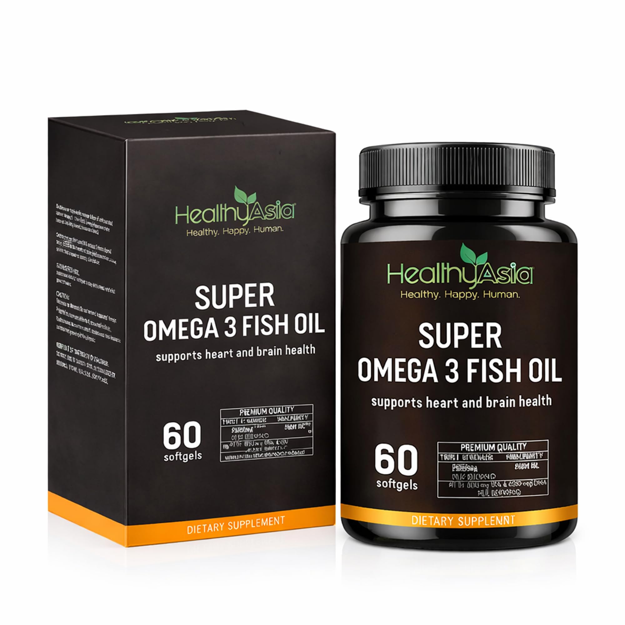 HealthyAsia Black Label Super Omega 3 Fish Oil 2000mg High Potency 800mg EPA & 600mg DHA per Serving Triple Strength Heart & Brain Health Support Burpless Citrus Softgels Non-GMO 60 Count