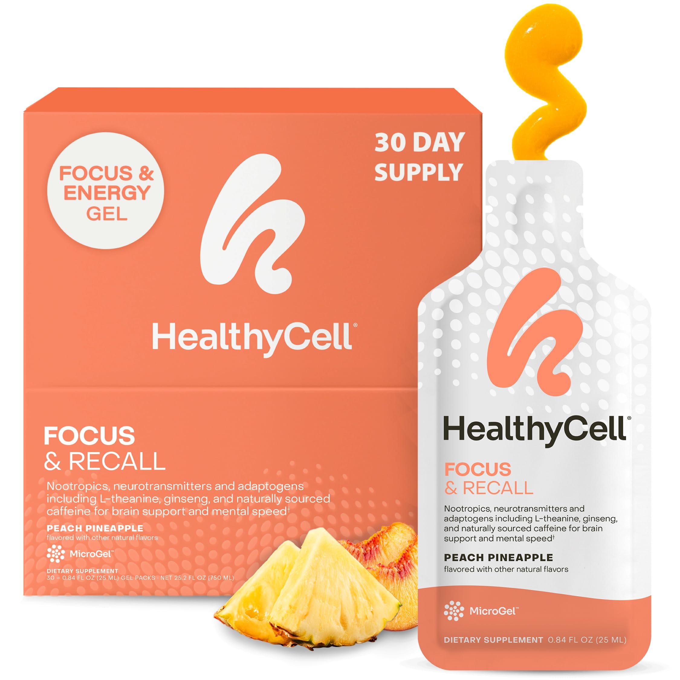 Next-Gen Nutrition: HealthyCell revolutionized what it means to take your vitamins with tasty, targeted MicroGels that absorb better than pills so you can reach your potential. Each complete formula contains clinically effective doses of science-backed ingredients for results you can feel. On-the-Go Gel Packs for Daily Focus: These easy-to-carry gel packs provide essential nutrients to fuel cognitive performance, making them a convenient choice for travel or everyday mental clarity. Use daily to help support sharper focus and recall and to support long term brain health with protective antioxidants ginseng and curcumin, along with phosphatidylserine. No Junk: Formulated using only premium natural ingredients. No fillers, binders or coatings. Just delicious daily nutrition that works. Vegan, gluten free, soy free, and non-GMO. Great-Tasting Experience: Tastes like a fruity peach pineapple gummy. For best results, take one gel pack daily to support mental speed. Enjoy straight from the gel pack, mixed into a drink or blended into a smoothie. Store in the refrigerator and serve chilled for the best experience. All-in-One Formula Replaces 9 Pills: The future of vitamins is pill free. This physician and nutritionist formulated gel pack helps support cognitive performance with over 1,444 mg of nootropics including B vitamins, curcumin, ginseng, omega 3, L-theanine, Huperzine-A, tyrosine, and natural caffeine. Ultra-Absorbable MicroGel to Support Peak Productivity: Top nutritional scientists developed our smooth and flavorful MicroGel to deliver ultra-absorbable nutrients so you can Absorb More. Clinically proven to deliver 165 more absorption than tablets. Complete Cognitive Performance Support: HealthyCell Focus Recall is a comprehensive brain-boosting supplement in a highly absorbable MicroGel. A powerful blend of nootropics, vitamins, and nutrients that help support focus, concentration, recall, and mental speed so you can avoid mental distraction and stay on task—all in a great-tasting peach pineapple-flavored MicroGel.
