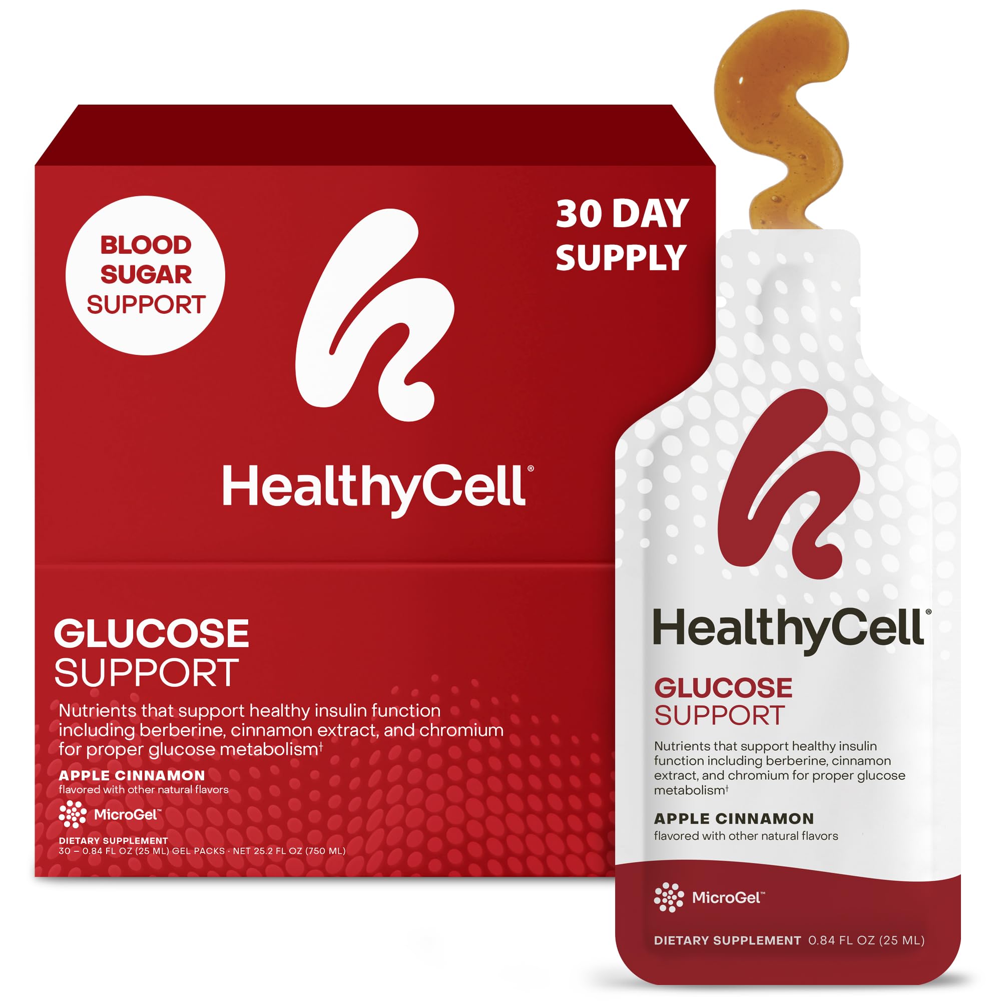 Next-Gen Nutrition: HealthyCell revolutionized what it means to take your vitamins with tasty, targeted MicroGels that absorb better than pills so you can reach your potential. Each complete formula contains clinically effective doses of science-backed ingredients for results you can feel. On-the-Go Gel Packs for Daily Metabolic Support: These easy-to-carry gel packs provide essential nutrients for glucose support, making them a convenient choice for travel or daily use. Use as part of your diet to maintain a healthy blood sugar level. No Junk: Formulated using only premium natural ingredients. No fillers, binders or coatings. Just delicious daily nutrition that works. Vegan, gluten free, soy free, and non-GMO. Great-Tasting Experience: Tastes like a fruity apple cinnamon gummy. For best results, take one gel pack daily to support glucose metabolism. Enjoy straight from the gel pack, mixed into a drink or blended into a smoothie. Store in the refrigerator and serve chilled for the best experience. Why BerberiSOL: We use BerberiSOL berberine because it has increased absorption. 23 mg of BerberiSOL per serving, taken three times daily, is equivalent to 1,000 mg of native berberine. All-in-One Formula Replaces 6 Pills: The future of vitamins is pill free. This physician and nutritionist formulated gel pack helps support healthy blood sugar levels with 390 mg of nutrients including Cinnamon Bark Extract, Banaba Leaf Extract, Magnesium, Aloe Vera Powder, BerberiSOL Berberine, and Chromium. Ultra-Absorbable MicroGel to Support Glucose Metabolism: Top nutritional scientists developed our smooth and flavorful MicroGel to deliver ultra-absorbable nutrients so you can Absorb More. Clinically proven to deliver 165 more absorption than tablets. Complete Blood Sugar Balance Support: HealthyCell Glucose Support is a comprehensive glucose support supplement in a highly absorbable MicroGel. A blend of plant extracts, vitamins, and minerals that help support proper glucose metabolism and support healthy metabolic function, all in a tasty apple cinnamon-flavored MicroGel.