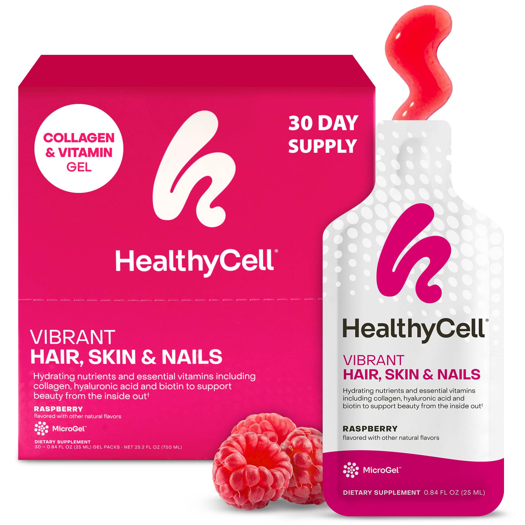 Next-Gen Nutrition: HealthyCell revolutionized what it means to take your vitamins with tasty, targeted MicroGels that absorb better than pills so you can reach your potential. Each complete formula contains clinically effective doses of science-backed ingredients for results you can feel. Travel-Friendly Collagen Biotin Boost for Radiant Skin: Compact and convenient, these gel packs are easy to take on the go for collagen production and biotin absorption to help with hair thickness and nail strength no matter where you are. No Junk: Formulated using only premium natural ingredients. No fillers, binders or coatings. Just delicious daily nutrition that works. Gluten free, soy free, and non-GMO. Great-Tasting Experience: Tastes like a fruity raspberry gummy. For best results, take one gel pack daily to support healthy hair, skin, and nails. Enjoy straight from the gel pack, mixed into a drink or blended into a smoothie. Store in the refrigerator and serve chilled for the best experience. All-in-One Formula Replaces 8 Pills: The future of vitamins is pill free. This physician and nutritionist formulated gel pack helps support hydrated skin, healthy hair, and strong nails with over 2,757 mg of collagen, biotin, hyaluronic acid, and other essential nutrients. Ultra-Absorbable MicroGel Collagen Biotin Complex: Top nutritional scientists developed our smooth and flavorful MicroGel to deliver ultra-absorbable nutrients so you can Absorb More. Clinically proven to deliver 165 more absorption than tablets. A Daily Glow-Boosting Supplement: Be radiant from the inside out with HealthyCell Vibrant Hair, Skin Nails. Hydrating nutrients, nourishing plant extracts, essential vitamins, and collagen building blocks help to provide a noticeable beauty boost. Everything you need to support healthy hair, skin and nails in a juicy, raspberry-flavored MicroGel.