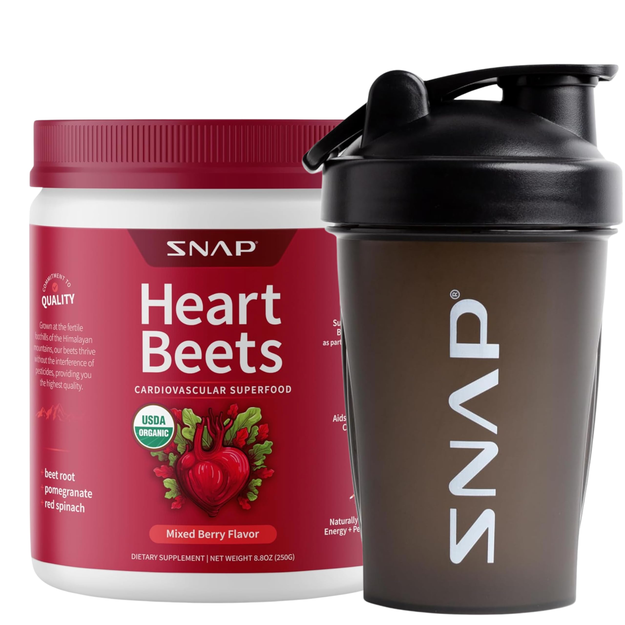 QUALITY YOU CAN TRUST: Snap Supplements delivers quality you can trust. Our vitamins and supplements are crafted by health experts and manufactured in the USA with globally sourced ingredients. Most of our supplements are vegan, plant based, caffeine free, sucralose free, soy free, allergen free, and contain no added sugar. EASY TO INCORPORATE, EASY TO LOVE: Just one scoop of Heart Beets mixed with water or your favorite smoothie delivers a potent dose of healthy heart-supporting nutrients in a delicious Mixed Berry flavor — perfect as a daily wellness ritual or pre-workout boost. ANTIOXIDANT SUPPORT: Packed with polyphenols and antioxidants from beetroot and pomegranate, Heart Beets helps protect against free radicals and supports healthy hearts. DAILY ENERGY SUPPORT: Designed for both men and women, this supplement offers targeted nutrition to support blood flow and oxygen delivery, helping you stay active and energized throughout the day. Snap Supplements' Heart Beet blend is a unique formula featuring nitrate-rich beetroot, red spinach, and pomegranate to support healthy circulation and vascular function.