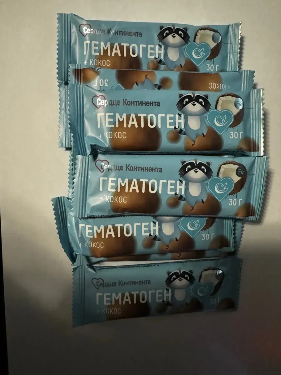 Гематоген по классической рецептуре: сахарный песок, молоко цельное сгущенное с сахаром, патока крахмальная, ванилин и альбумин - порошок гемоглобина, насыщающий организм железом.