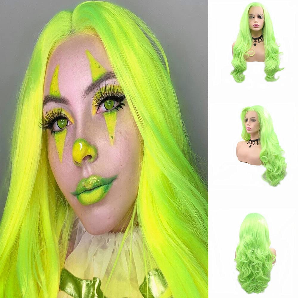 Heat-resistant natural hair base hairstyle for women cosplay bright color fluorescent green synthetic hair lace front wig for drag queen long hair corrugated handmade wigs
