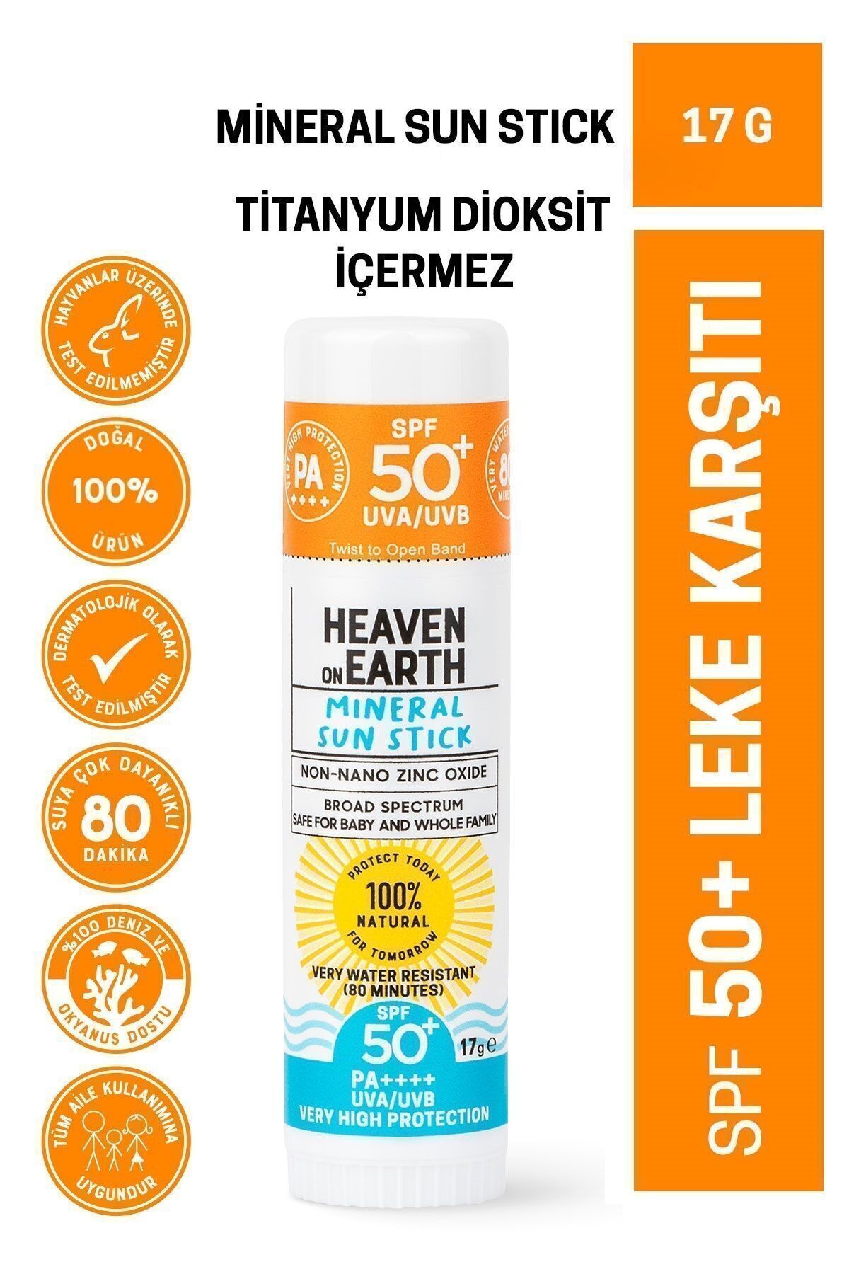 Suya Dayanikli 100 Dogal ve Organik içerikli Mineral Günes Koruyucu Stick Spf 50 Pa , Çok yüksek koruma 17gr Mineral koruma: 100 Dogal ve Organik içerikli 50 SPF PA korumali 17 gr Mineral Günes Koruyucu Stick nano olmayan çinko oksit sayesinde günesin UVA UVB zararli isinlarina karsi cildinizi korumaya yardimci olurken, Lavanta ve vanilyanin dogal hos kokusu ile birlikte içerisindeki organik buriti yagi, antioksidan nar ve üzüm çekirdegi yaglari ile cildinizi besler ve nemlendirir. Özel formülü ile EN HASSAS BEBEK ve ÇOCUK ciltlerini UVA ve UVB isinlarina karsi TAM ETKIN bir sekilde korur. Tüm ailenin kullanimi için uygundur. 80 dakikaya kadar suya dayaniklidir.