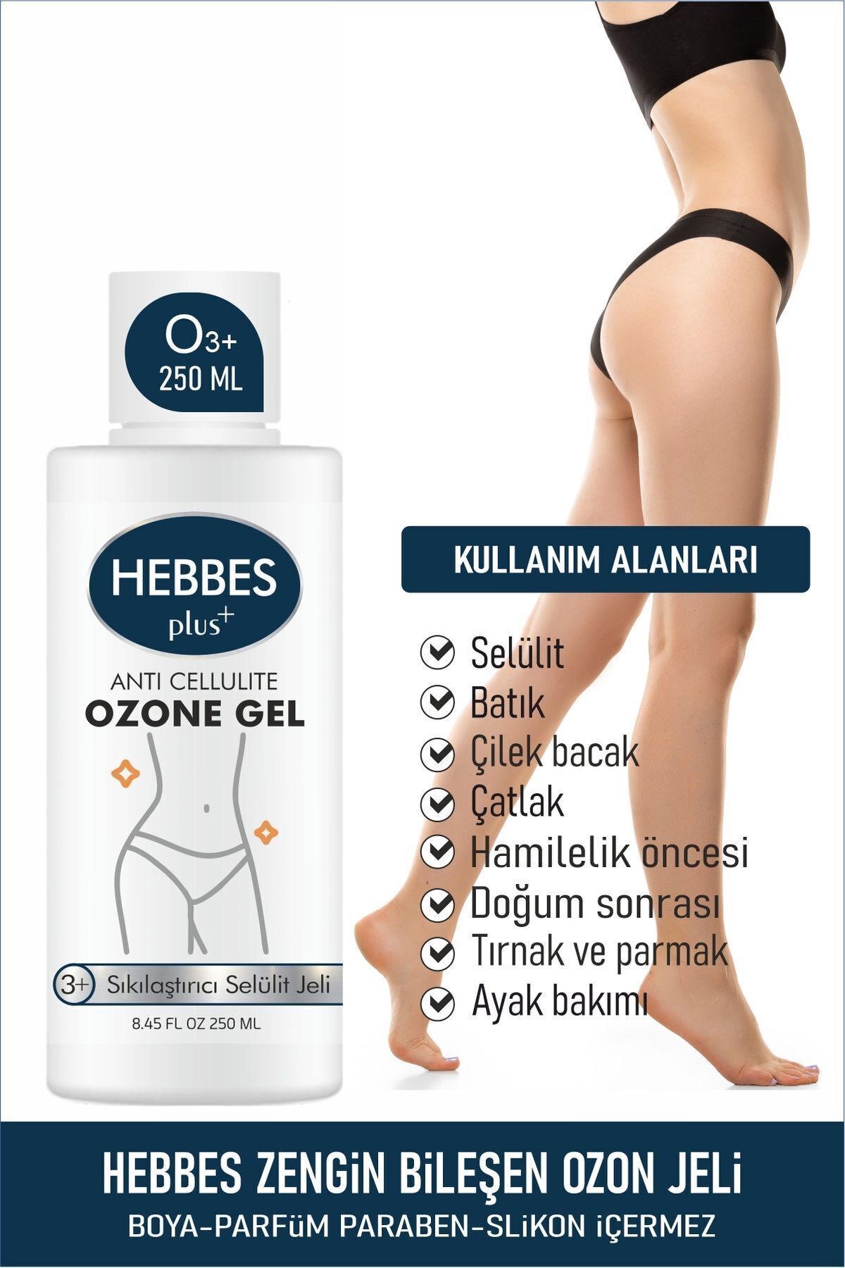 Thus, HEBBES Ozone Gel applied to the body with massage accelerates blood circulation under the skin and prevents cellulite formation Thanks to the other oils in its formula, elastin and collagen production is supported in the subcutaneous layer of the skin, skin tightening is provided and a silky texture is given to the skin.