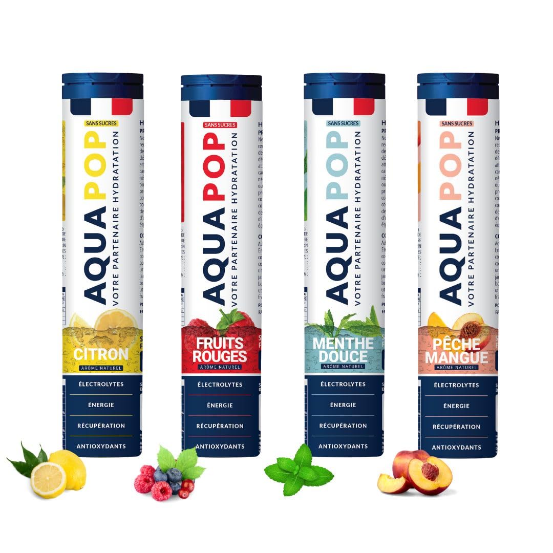 AQUAPOP - Pastilles électrolytes - Pack de 4 tubes - Sans Sucres - Favorise l'hydratation et l'énergie - 80 Comprimés Minéraux et Vitamines - Sport Bien-être - 4 Pack