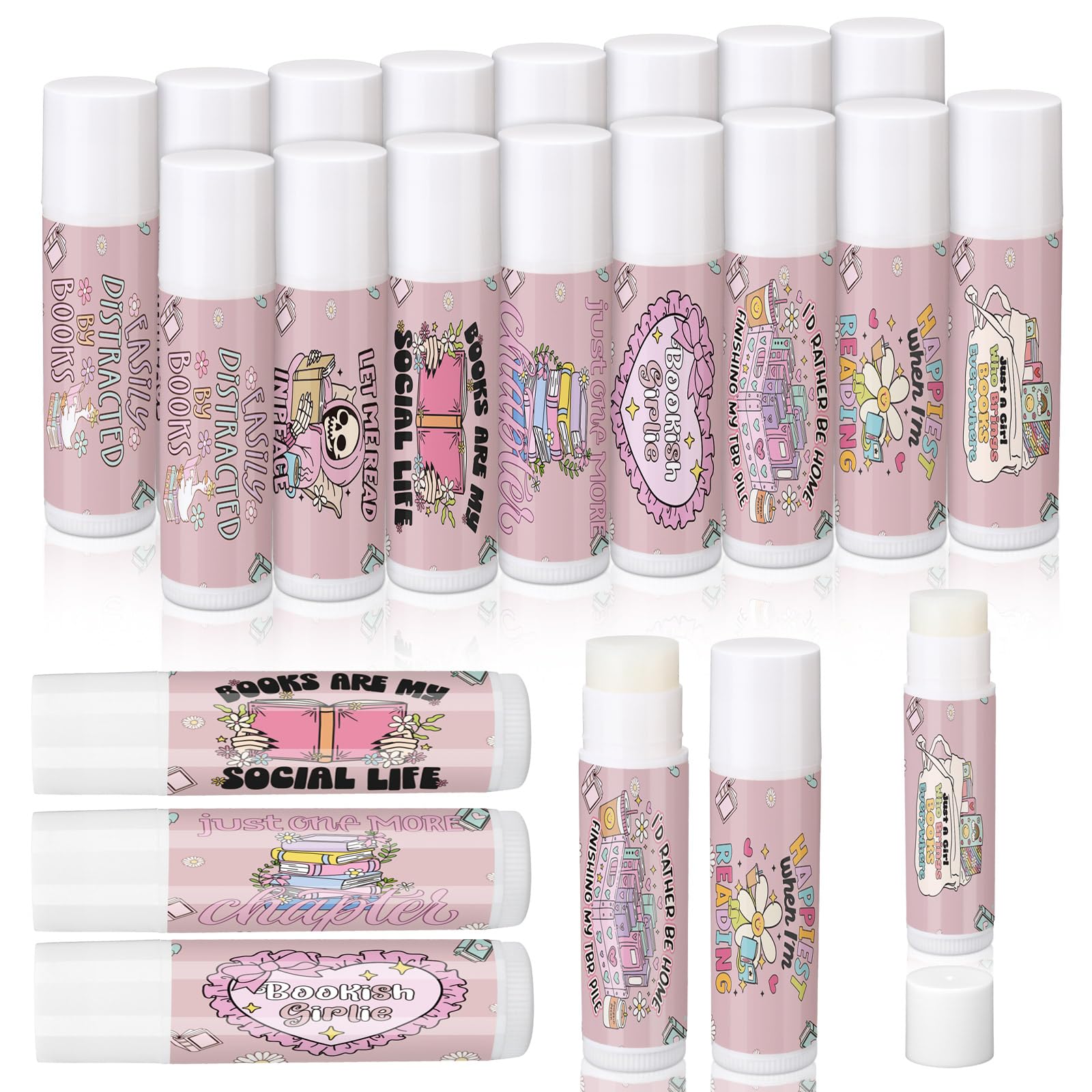 Features: Nourishing and moisturizing: Relieve dryness and tightness, prevent skin dryness and cracking, timely replenish moisture needed by dry skin, and make lip skin moist and shiny. Bookish Lip Balm Gifts for Book Club: The capacity of lipstick is 0.15 ounces, which is fine, smooth and convenient, bringing you a scholarly atmosphere and easily meeting your needs. Office Autumn Halloween Thanksgiving lipstick has a moisturizing and mild effect, which can prevent dry and cracked lips and give them a comfortable feeling. Specifications: Material: natural ingredients Color: pink Size: about 4.5g Package includes: 16x Bookish Lip Balms Notes: Manual measurement, please allow slight errors on size. The color may exist a slight difference due to different screen displays. Our product is not suitable for sensitive skin. Test whether there is any allergy on a small part of your skin before use. Please stop applying if there is any discomfortWide Range of Application: our book lip balms provide nourishing care for the lips, making them feel soft and smooth You can use it in other occasions, such as home, office, book club and office Christmas party It is very suitable for Thanksgiving and Christmas parties Your guests and book friends will like these bookish gifts. Gift Choice: You can put lipstick and some candies with the theme of Club in a transparent gift box (not included) This set of lipstick is not only suitable for yourself, but also an choice for relatives and friends Can easily meet your needs and create an atmosphere for this occasion Those who receive these bookish lipstick can also share them with friends or family. Bookish Stocking Stuffers: this book lip balms are designed with classic book patterns, giving people an elegant feeling There are 8 fragrances including honey, vanilla, strawberry, original flavor, cherry, cherry blossom, rose, and apple, which are very relaxing and enjoyable to use You, your friends, family, or guests will all love their fragrance, which can give you a good mood and moisturize your lips for a long time. Moisturize Chapped Lips: our book lip balm has a moisturizing and mild effect, which can prevent the lips from drying and cracking, and make the lips feel smooth and soft At the same time, the lips will not be waxed or greasy, bringing you a good experience of using dry lips in cold winter You can use them in the office, bedroom, home, or outdoors. What You Can Get: you will get a set of book club gifts lip balms Each fragrance comes in a separate package with a capacity of 0.15 oz, making it easy to carry and lightweight They are easy to clean, reusable, and can be easily stuffed into pockets, wallets, or any bag, ensuring you have them at all times when your lips need hydration.