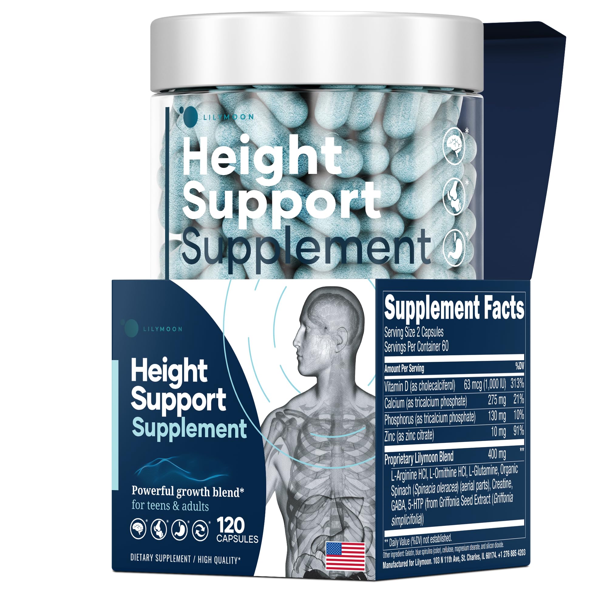 Height Bone Support Supplement - Premium Growth Formula for Kids Teens Support natural growth with our height growth supplement, packed with calcium for kids, vitamins for teens, and essential growth vitamins. This height booster promotes bone growth and overall wellness. Made in USA, it combines calcium supplement for kids with vitamin D for strong bones and height increase. Ideal for teen boy vitamins multivitamin needs, it works as a heightener supplement for teenager vitamins for boys. Contains calcio para niños and vitaminas para crecer estatura (suplementos para crecer de altura). Supports height growth increase for kids teens adults with growth complex nutrients. Also acts as an appetite booster for teens. No artificial additives.Customer Care You Can Trust – 100 Satisfaction Guaranteed - At Lilymoon, we prioritize your health and satisfaction. Our height support supplement for kids and teens is carefully formulated with essential vitamins and minerals to complement a healthy diet. If you have any questions, our customer support team is ready to help. We stand behind our growth support formula and are committed to providing the best experience possible. Made in the USA - Premium Height Bone Support Formula - Proudly made in the USA, our bone health supplement is manufactured in a GMP-certified facility to ensure purity and safety. Lilymoon height support vitamins contain only high-quality ingredients like L-Glutamine, phosphorus and organic spinach, free from GMOs, gluten, and unnecessary additives. We are committed to providing the best supplement for bone strength, joint flexibility, and overall nutritional support. Naturally Colored with Blue Spirulina – No Artificial Dyes - We believe in clean ingredients, which is why Lilymoon height support pills contain blue spirulina, a natural alternative to synthetic dyes. This superfood is a source of protein, omega-3s, and antioxidants that support overall health. Our growth support formula is designed for kids, teens, and adults seeking a safe, effective way to grow taller. Essential Vitamins Minerals for Bone Strength - Strong bones are built with the right nutrients! Our height support supplement for kids, teens, and adults includes Calcium, Vitamin D, Zinc, L-Ornithine, and L-Glutamine, all known for their role in bone density, muscle function, and joint health. These essential teen boy vitamins multivitamin ingredients work together to support natural development and complement an active lifestyle. Nutritional Support for Growing Kids Teens - Lilymoon Height Bone Support Supplement is formulated to provide essential nutrients for kids boys girls, teens, and adults. Our carefully selected blend of Calcium, Vitamin D 1000 IU, Zinc 10mg, and L-Ornithine helps support bone health, flexibility, and overall wellness. A balanced diet with the right nutrition is key to maintaining strong bones and active growth support (suplementos para crecer de altura) at every stage of life.