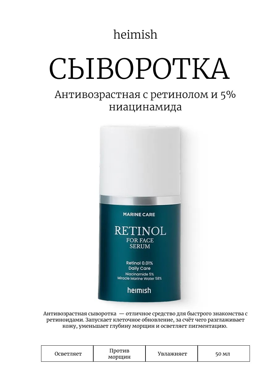 | Комплектация | Heimish Антивозрастная сыворотка с ретинолом и 5% ниацинамида Marine Care Retinol For Face Serum |