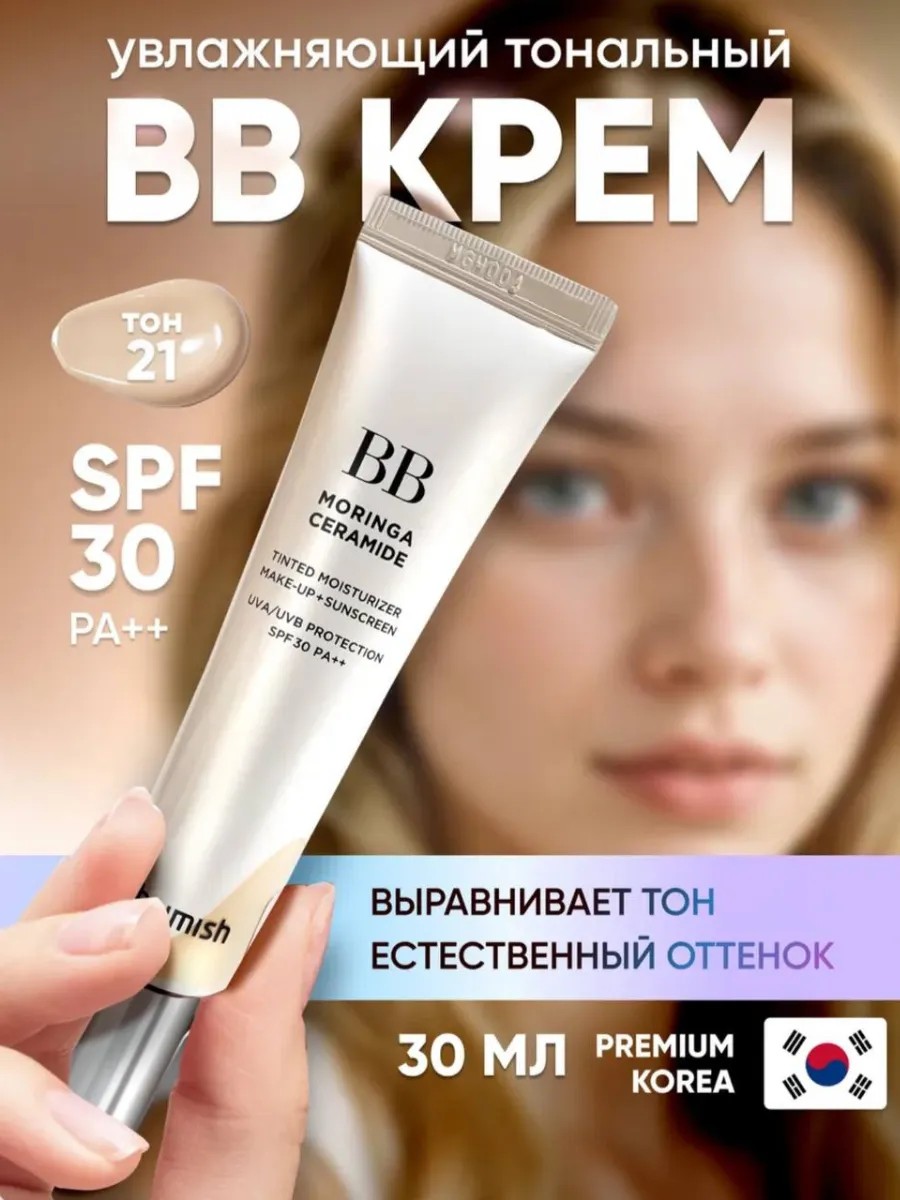 Тональный крем для лица BB Moringa Ceramide в оттенке 21 Light Beige от Heimish — это тональный крем, который сочетает макияж и уход за кожей благодаря увлажняющим и восстанавливающим компонентам, таким как экстракт моринги и церамиды. Он помогает выровнять тон лица, скрывает несовершенства, при этом сохраняя естественный вид и сияние кожи. Оттенок 21 Light Beige подходит для светлой кожи с нейтральным подтоном и легко адаптируется к цвету кожи, придавая ей свежесть и здоровый вид.