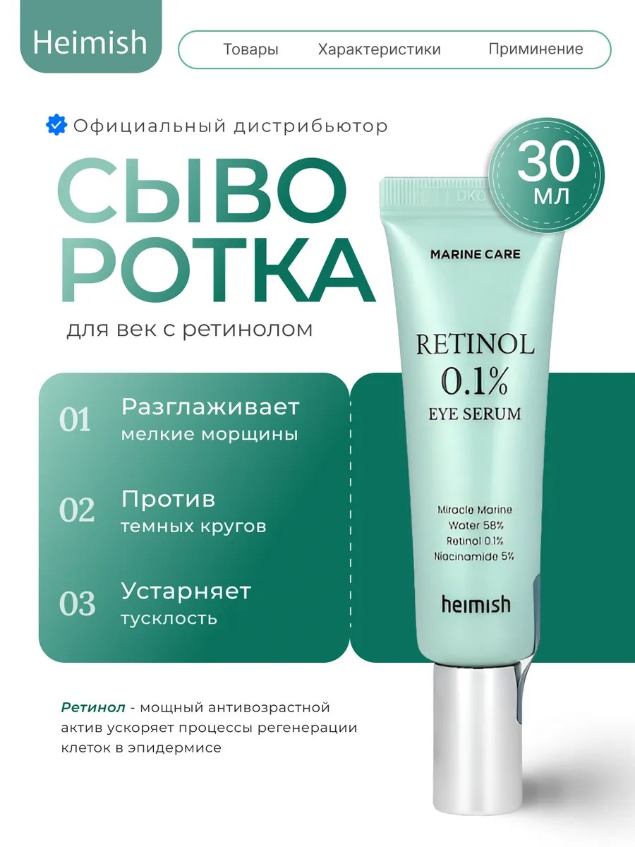 Heimish Marine Care Retinol Eye Serum, an anti-aging eye serum with retinol, has a multifunctional effect on the delicate skin around the eyes: it gently brightens and reduces the appearance of dark circles, strengthens and improves tissue elasticity, smoothes fine lines and intensely moisturizes.
