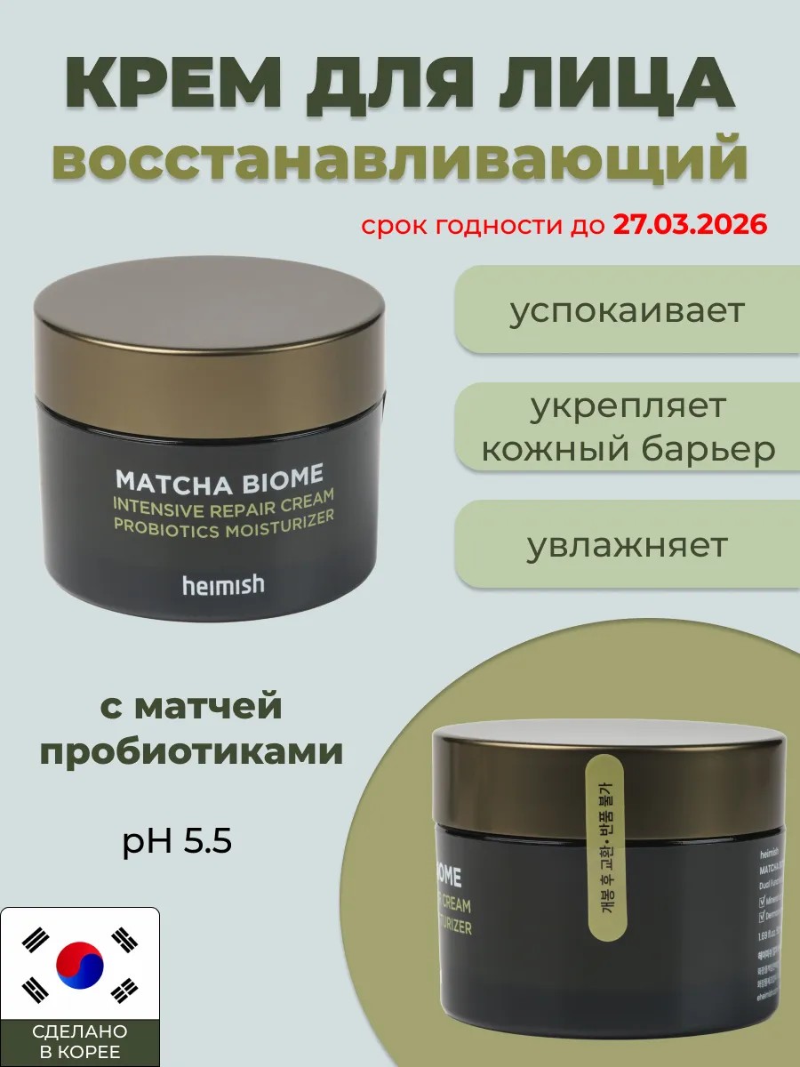 Восстанавливающий увлажняющий крем для лица с матчей пробиотиками Heimish Matcha Biome Intensive Repair Cream успокаивает чувствительную и раздражённую кожу лица, укрепляет защитный барьер, заживляет и насыщает антиоксидантами. Слабокислотная формула с pH 5.5, содержит комплекс Matcha Biome, пантенол и ниацинамид, экстракты зелёного чая и центеллы. Не содержит спирта, парабенов, сульфатов и минеральных масел.