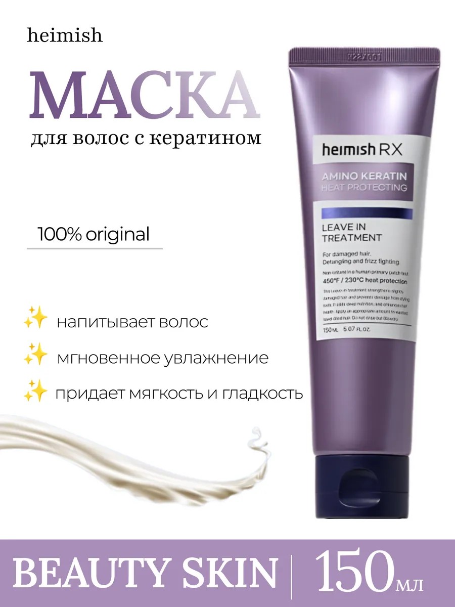 Восстанавливающая маска для волос Heimish RX Amino Keratin Heat Protecting Leave In Treatment - несмываемая кремовая маска с потрясающей легкой текстурой, которая наносится после использования шампуня и обеспечивает мгновенное увлажнение волосам, напитывает, придает им мягкость и гладкость, облегчает укладку и дарит ухоженный вид.