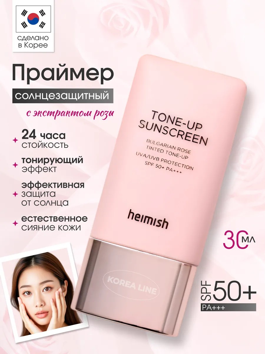 The HEIMISH Bulgarian Rose Tone-up Sunscreen SPF 50+ PA+++ prevents UV damage, moisturizes, evens skin tone, and imparts a natural glow. Contains physical and chemical filters, niacinamide, and adenosine. Suitable for oily and combination skin. Directions: Shake well before use. Apply a generous amount evenly to your face and neck 15-20 minutes before sun exposure.