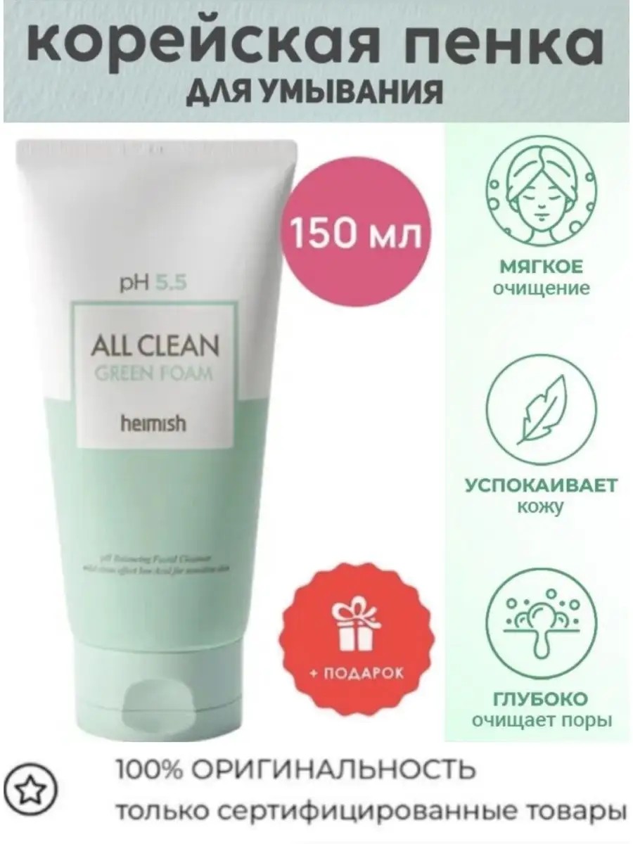 Слабокислотный гель для умывания для чувствительной кожи Heimish pH 5.5 All Clean Green Foam имеет нейтральный pH 5.5 бережно очищает кожу от загрязнений, удаляет остатки макияжа, глубоко очищает поры, препятствует образованию комедонов.