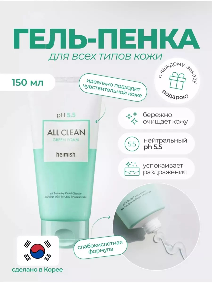 Heimish All Clean Green Foam mildly acidic cleansing gel for sensitive skin pH 5.5 has a neutral pH of 5.5, gently cleanses the skin of impurities, removes makeup residue, deeply cleanses pores, and prevents comedones.