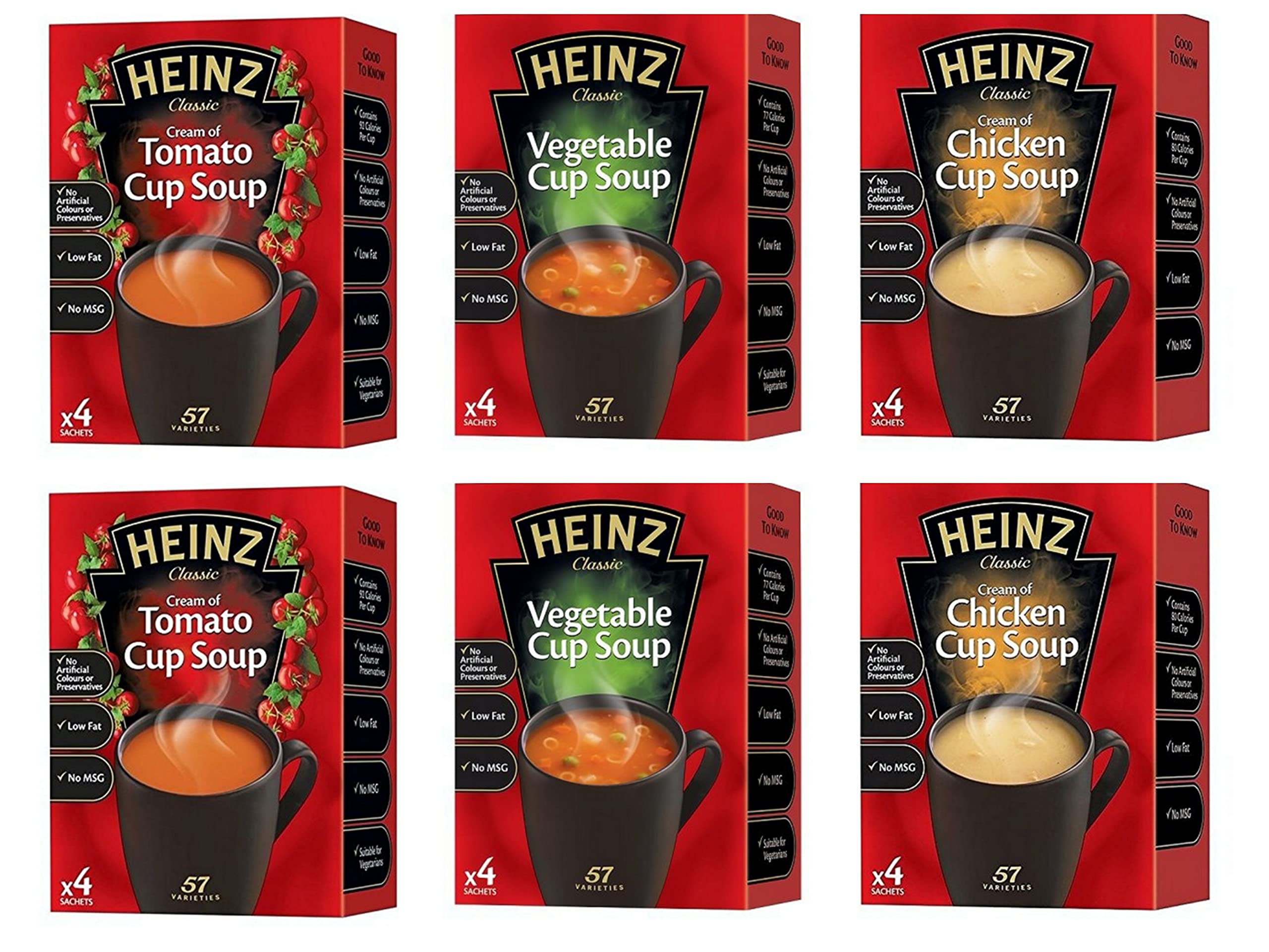 The nation's favorite soup, now available in a mug near you! Using their expertise, Heinz has developed this delicious new range of mug soups. Cream of Tomato contains 92 calories per mug Vegetable Soup contains 77 calories per mug Cream of Chicken contains 80 calories per mug Empty into a mug, add 230ml of boiling water, stir well, relax, and enjoy! Comes with an exclusive Kingdom Supplies recipe tip sheet and, when purchased from Biblegifts, comes with our 12-month total satisfaction guarantee. INGREDIENTS Tomatoes (67 ), water, sugar, modified potato starch, potato starch, sunflower oil, salt, glucose syrup, flavoring (contains milk), milk proteins, colors: beetroot red, mixed carotenes and riboflavin, palm oil, modified corn flour, citric acid, emulsifier - mono- and diacetyl esters of fatty acids, stabilizers - diphosphates INSTRUCTIONS Add 1 cup of hot water, wait 2-3 minutes, stir well and enjoy. See moreHeinz Lot de 6 boîtes de soupe - Saveurs tomates, poulet et légumes - 2 paquets de 4 sachets de chaque bouillon instantané - Feuille de conseils de recettes exclusive Kingdom SuppliesDESCRIPTION DU PRODUIT DESCRIPTION DU PRODUIT La soupe préférée des nations, maintenant disponible dans une tasse près de chez vous! En utilisant leur savoir comment Heinz a développé cette délicieuse nouvelle gamme de soupes de tasses. Crème de tomate contient 92 calories par tasse La soupe aux légumes contient 77 calories par tasse Crème de poulet contient 80 calories par tasse Vider dans une tasse, ajouter 230 ml d'eau bouillante, bien mélanger, se détendre et profiter! Livré avec une feuille de conseils de recettes exclusive Kingdom Supplies et une fois acheté chez Biblegifts est livré avec notre garantie de satisfaction totale de 12 mois. INGRÉDIENTS Tomates (67 ), eau, sucre, amidon de pomme de terre modifié, amidon de pomme de terre, huile de tournesol, sel, sirop de glucose, arôme (contient du lait), protéines de lait, colorants : rouge betterave, carotènes mélangés et riboflavine, huile de palme, farine de maïs modifiée, acide citrique, émulsifiant - Esters d'acide mono- et diacétyle. Diglycérides d'acides gras, stabilisateurs - diphosphates MODE D'EMPLOI Ajoutez 1 tasse d'eau chaude, attendez 2-3 minutes, mélangez bien et dégustez. Voir plus