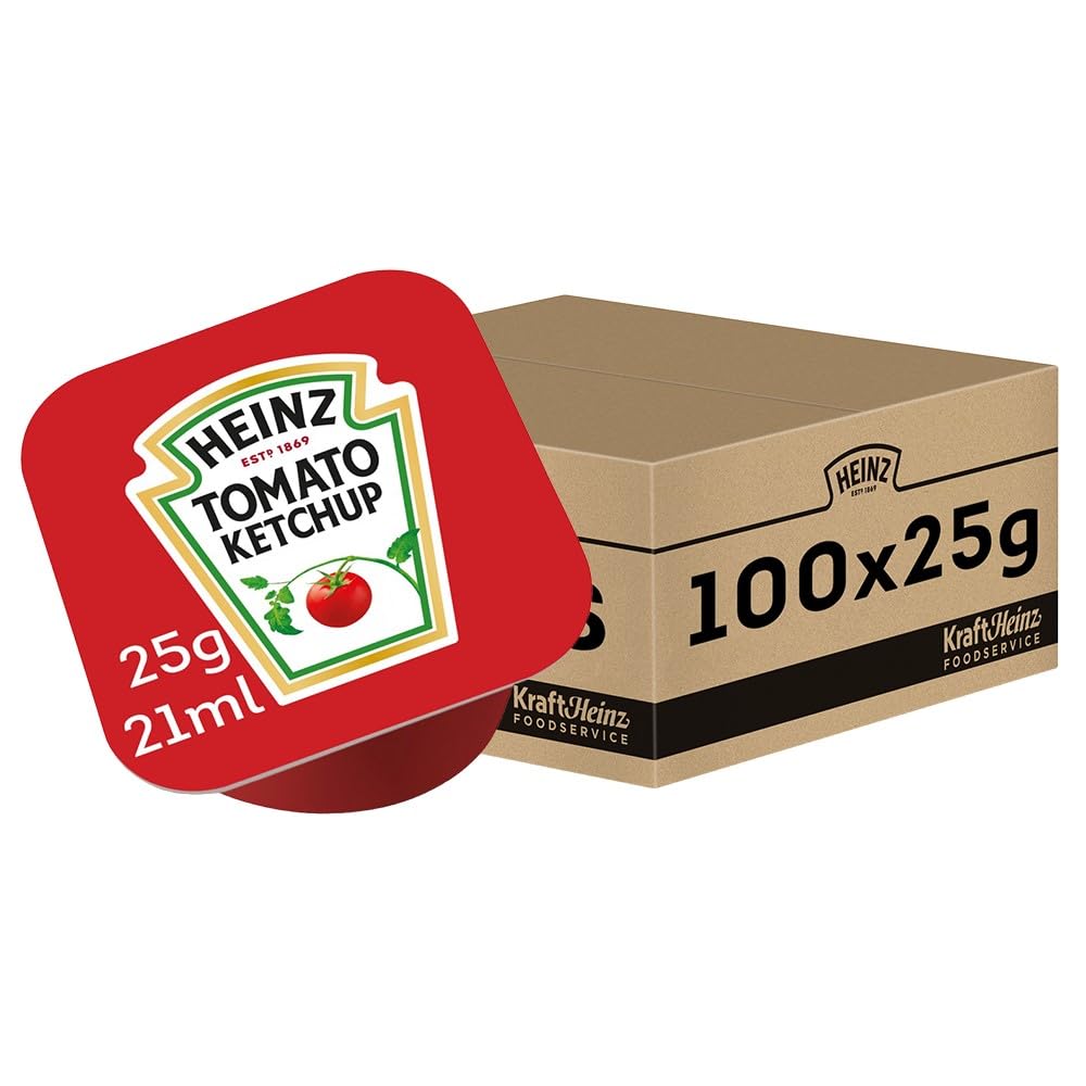 Our classic HEINZ ketchup has been a staple on every household's table since 1886. Thanks to our sun-ripened tomatoes, our passion and expertise allow us to create a unique recipe with the irresistible and unrivaled Heinz taste. Our ketchup, made with cultivated tomatoes, pairs perfectly with almost any dish. It contains no artificial colors, flavors, preservatives, or thickeners. No other tomato sauce tastes the same. Gluten-free and suitable for vegetarians. At HEINZ, we are committed to the environment and place great importance on the soil, the true protagonist of the quality that characterizes our products. That's why we work hand in hand with SAI (Sustainable Agricultural Initiative), the sustainable agriculture organization, defining the principles of regenerative agriculture and setting new industry standards that improve soil health and protect our greatest source of food. INGREDIENTS Tomatoes, spirit vinegar, sugar, salt, spice extract (contains APIO), herbs, and spices. INSTRUCTIONS Ready to eat SAFETY WARNING Suitable for all ages See moreHeinz Ketchup Dip Pot 25 g x 100 sans glutenDESCRIPTION DU PRODUIT DESCRIPTION DU PRODUIT Notre ketchup HEINZ classique est une sauce essentielle sur la table de chaque foyer depuis 1886. Grâce à nos tomates mûries au soleil, notre passion et nos connaissances nous permettent d'obtenir une recette unique avec le goût irrésistible et inégalé de Heinz. Notre ketchup de tomates cultivées se marie parfaitement avec presque tous les plats. Sans colorants, arômes, conservateurs ou épaississants artificiels. Aucune autre sauce tomate n'a le même goût. Sans gluten et adapté aux végétariens. Chez HEINZ nous engageons en faveur de l'environnement et mettons l'accent sur le sol, le véritable protagoniste de la qualité qui caractérise nos produits. C'est pourquoi nous travaillons main dans la main avec SAI (Sustainable Agricultural Initiative), l'organisation d'agriculture durable, définissant les principes de l'agriculture régénérative et établissant de nouvelles normes pour l'industrie qui améliorent la santé des sols et protègent notre plus grande source de nourriture. INGRÉDIENTS Tomates, vinaigre d'alcool, sucre, sel, extrait d'épices (contient de l'APIO) et herbes aromatiques, épices. MODE D'EMPLOI Prêt à être consommé AVERTISSEMENT DE SÉCURITÉ Pour tous les âges Voir plus