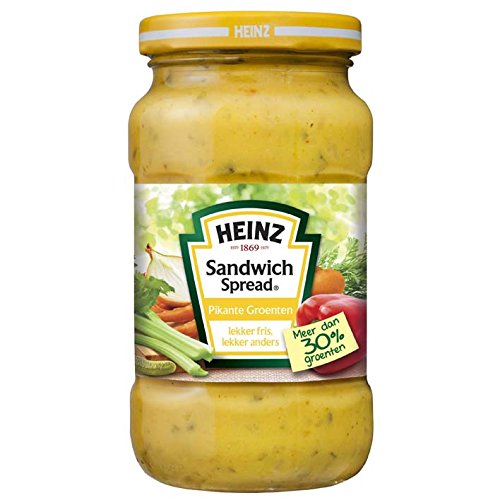 Heinz Spiced Vegetable Sandwich Spread 300g INGREDIENTS 43 vegetables (cucumber, onions 11 , carrots, celery, kohlrabi 4.1 , 3.8 , 1.8 ), red pepper, vinegar, sugar, vegetable oil, salt, skimmed milk powder, modified starch, spices (contains mustard), thickener (guar gum), color (lutein), acid (lactic acid), flavoring, spice extract, plant extract. INSTRUCTIONS FOR USE Spread directly onto bread, crackers, or rusks. Use for breakfast or in the morning. See more