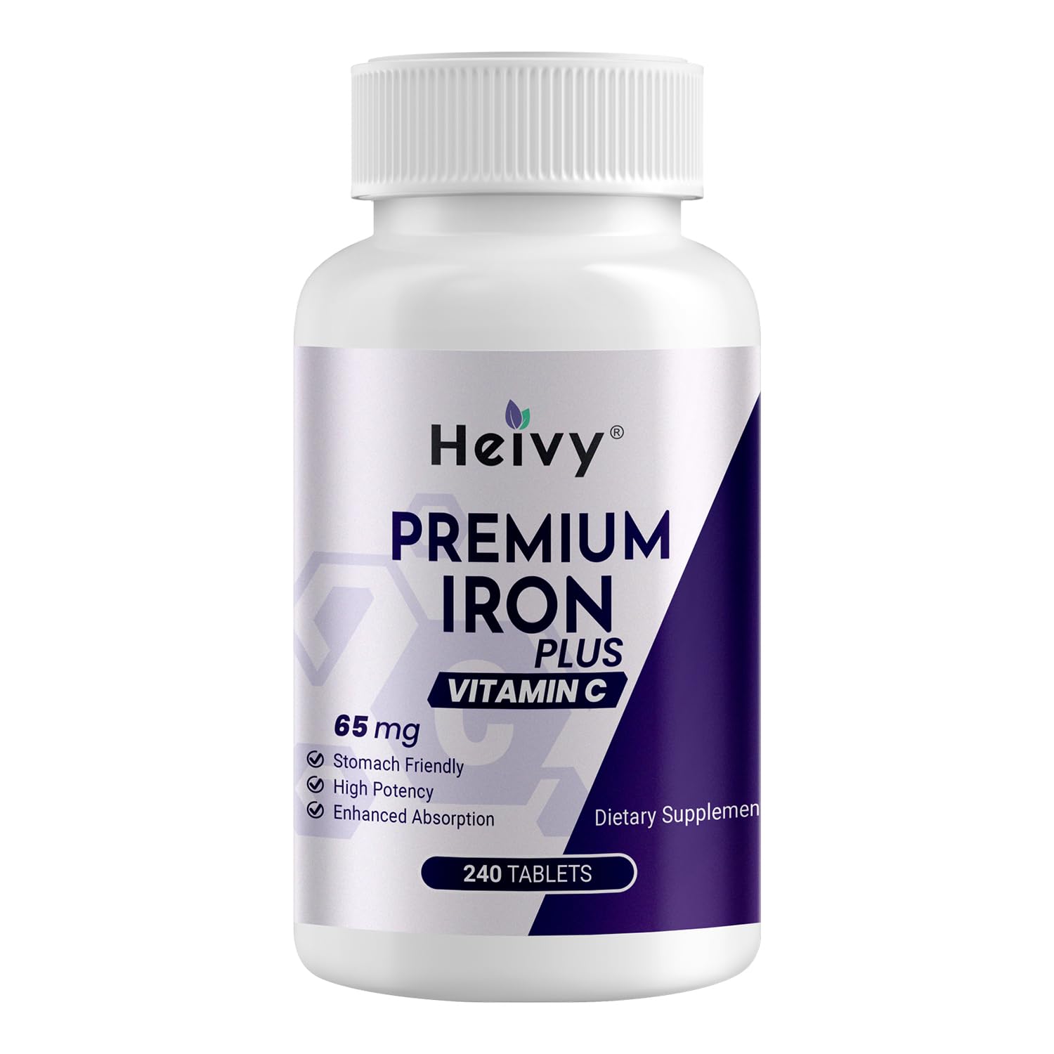 Heivy Ferrous Sulfate 325mg, Iron 65mg, Iron with Vitamin C High Potency Iron Supplement for Women & Men Premium Pure Ingredients, Gentle on Stomach, 240 Tablets, Made in USA