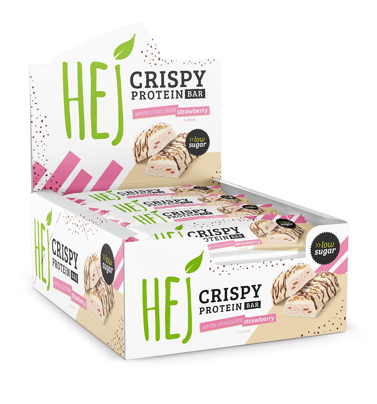HEJ Crispy Protein Bar - Per bar 1.9g sugar - Per bar 14g protein - Flavor: White Chocolate Strawberry - 12 x 45g