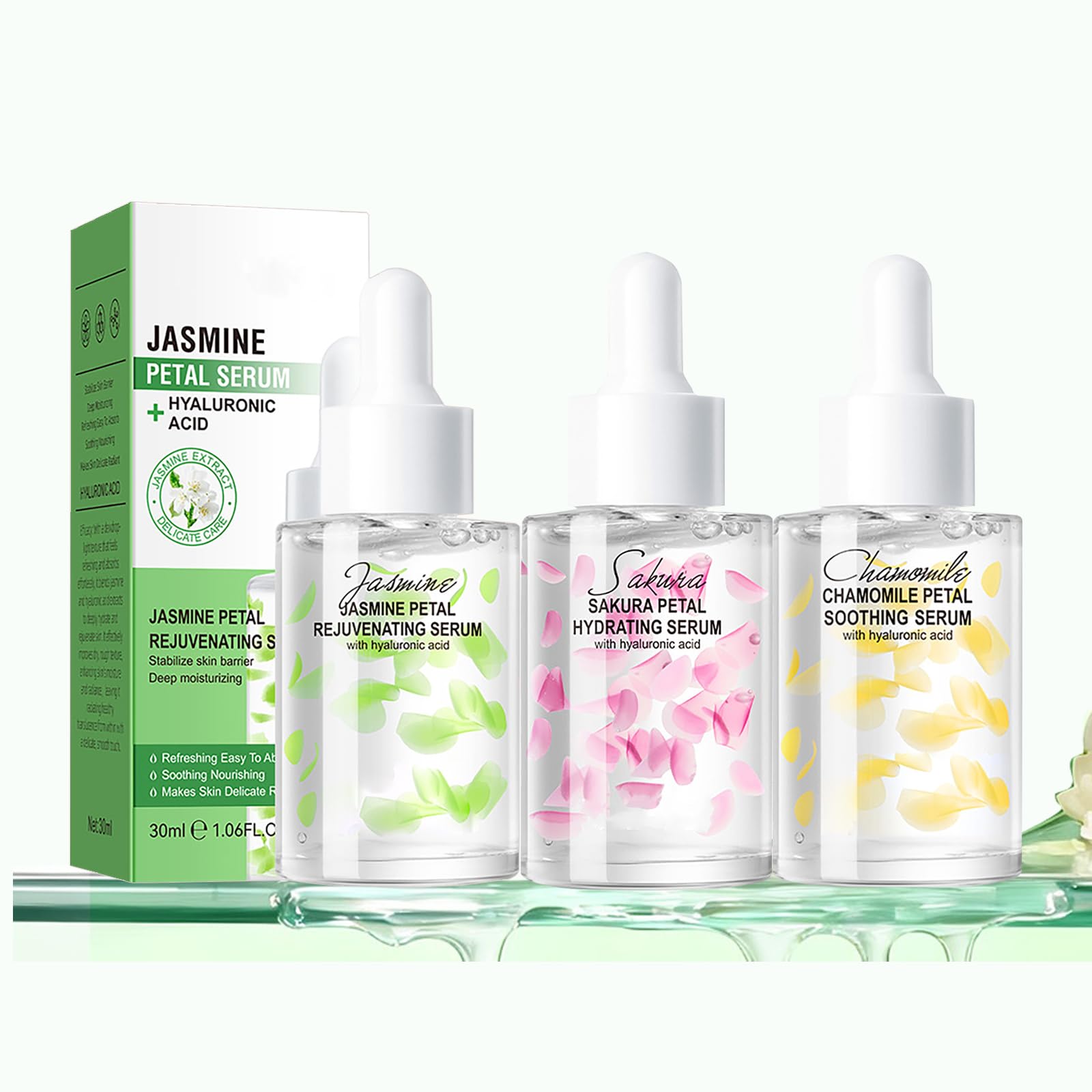 HELBR Hyaluronic Acid Serum - Skin-Refining Rejuvenating Care? Gentle Botanical Blend to Rejuvenate Refresh Your Skin ? KEY BENEFITS:✓ Deep Hydration: Intense moisturizing powered by Hyaluronic Acid. Skin feels soft, supple, and delicately nourished.✓ Revitalize Plump: Our Moisture Rejuvenating Serum replenishes skin's moisture barrier, helping it appear hydrated, smooth, and full of vitality.✓ Fast Absorption: Lightweight texture penetrates deeply to improve dry, rough skin without stickiness or residue.? TARGETS YOUR SKIN CONCERNS: ?Dryness DehydrationDull, tired-looking skinRough or uneven textureUneven skin tone lack of radiance? PRODUCT DETAILS: ?Product Name: HELBR Hyaluronic Acid Serum with Jasmine Petal, Cherry Blossom ChamomileSet Includes: 3 x 1.06 Fl Oz 90 mlSkin Type: All skin types, including sensitive skinFeature: This skin-refining serum effectively improves dry, rough texture while enhancing moisture and radiance. Leaves skin looking healthy, smooth, and glowing from within.DAILY USE EXCELLENT VALUE BUNDLE : Incorporate this skin-refining serum into your daily skincare routine. Apply to a clean face and neck morning and night. This convenient 3-pack bundle offers exceptional value, ensuring your favorite Hyaluronic Acid Serum is always on hand. GENTLE FOR ALL SKIN TYPES : This gentle yet effective serum is crafted for everyone. Whether you have dry, oily, combination, or sensitive skin, its non-irritating formula delivers the nourishing benefits of Hyaluronic Acid and botanicals without causing heaviness or clogging pores. REFINES TEXTURE RADIANT GLOW : Reveal a smoother, more refined skin texture. The blend of Cherry Blossom and Jasmine extracts helps to minimize the appearance of pores and fine lines, promoting a radiant, youthful-looking glow with every use. CALMS SENSITIVITY STRENGTHENS SKIN BARRIER : Formulated with calming Chamomile and Jasmine Petal, this Hyaluronic Acid Serum for Face works to soothe visible redness and discomfort. It helps stabilize your skin's natural barrier, making it more resilient against daily environmental stressors. DEEP HYDRATION SKIN REVITALIZATION : Experience intense hydration with our Moisture Rejuvenating Serum. Powered by pure Hyaluronic Acid, it dives deep to quench skin, lock in moisture, and revitalize your complexion, leaving it dewy and supple all day long.