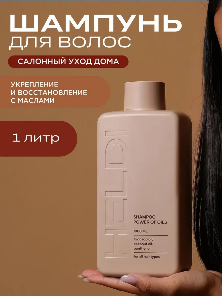 HELDI's premium line of women's hair shampoo features an improved formula with oils and natural ingredients, developed by trichologists. Avocado oil adds shine and elasticity, while olive oil prevents dehydration and split ends, providing nourishment and care. Coconut and walnut oils restore hair from the inside out at the cellular level and stimulate growth. Monarda extract relieves scalp irritation and inflammation, while aloe vera extract gently exfoliates dead skin cells. Shampoo Professional is suitable for normal, damaged, dry, and very oily hair, as well as combination hair. This deep-cleansing shampoo has a pleasant fruity scent that lingers for a long time. Whether you're blonde or brunette, redhead or brown-haired, curly or frizzy, color-treated, fine, or damaged, your hair will look well-groomed and strong. The restorative effect is noticeable after just a few uses of the cosmetic cleanser. The moisturizing and nourishing shampoo has a cumulative effect and is suitable for daily use. Professional hair cosmetics are the perfect birthday gift for your beloved wife, girlfriend, or sister.