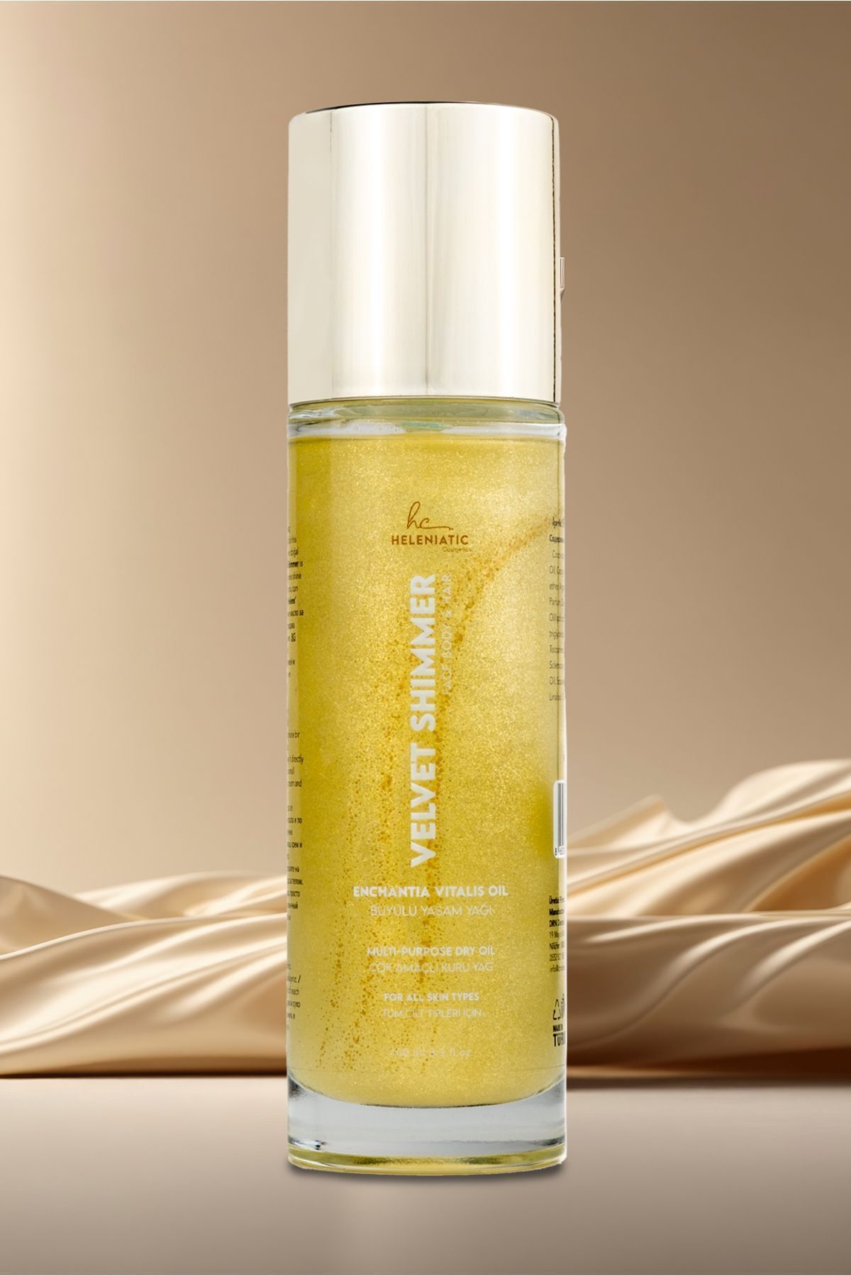 Helens' Velvet Shimmer Dry Oil! While it gives your skin a healthy shine with its glittering texture, it adds eye-catching vitality to your hair. It is with you to shine in every season, every moment.