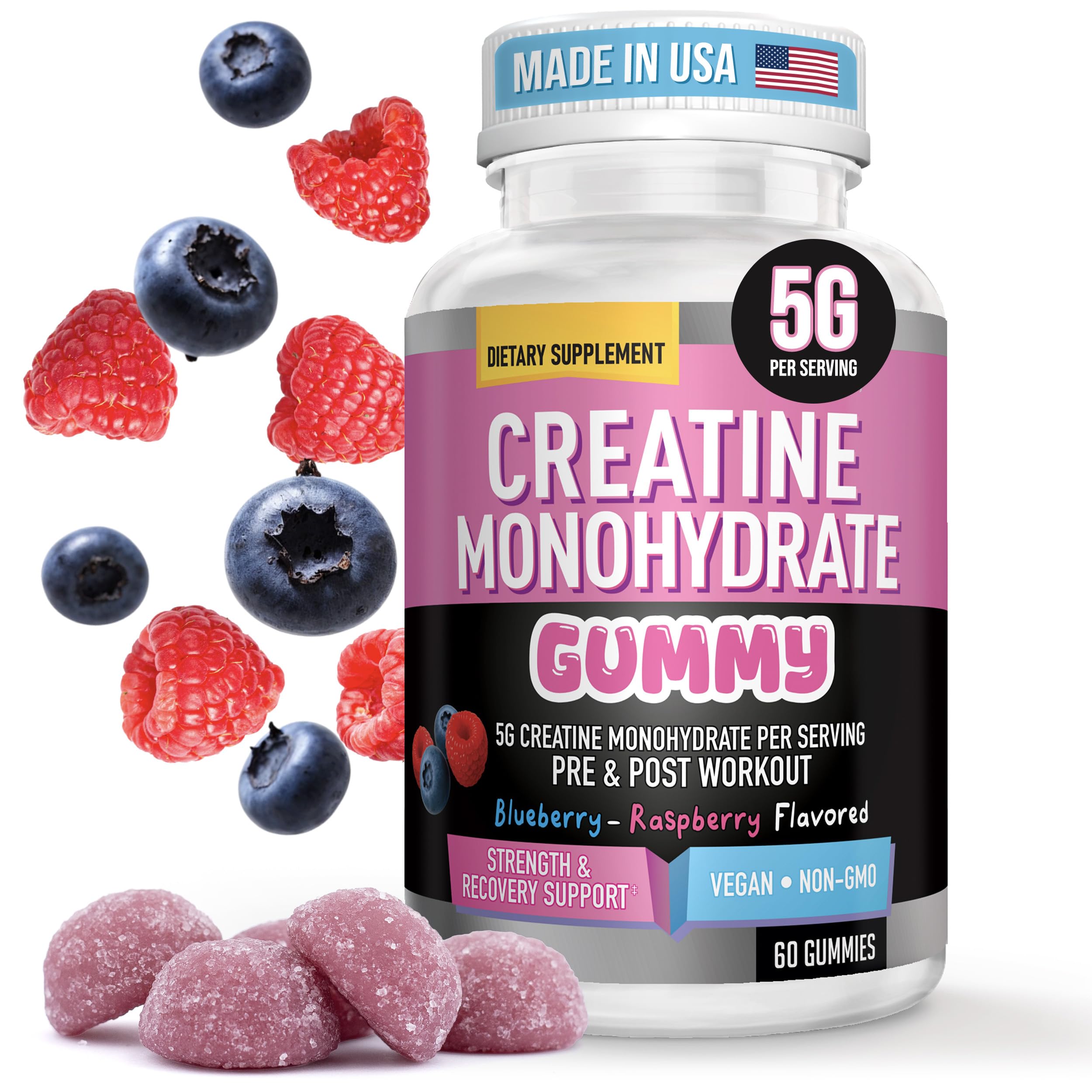Each 5-gummy serving provides 5g creatine—take once or twice daily with juice. Use pre post workout or as advised. Follow a 4–6 week on off cycle for best results. Designed to align with structured training and recovery periods. Vegan-friendly and halal-certified gummies made with pectin—not gelatin. Non-GMO formula suits diverse dietary needs, offering clean creatine support without animal byproducts or unnecessary additives. Tart-sweet sour watermelon blueberry raspberry flavors from natural ingredients make daily creatine enjoyable. Colored with real fruit and vegetable juice—zero synthetic dyes. A crave-worthy experience to maintain daily consistency without flavor fatigue. Supports ATP regeneration to enhance power, strength, and performance. Ideal for high-intensity training, including weightlifting, HIIT, and endurance work. Fuels short-burst activity and helps sustain energy during demanding workout sessions. These creatine chews deliver 5g creatine monohydrate in scoop-free gummies—no mixing or grit. Easy to take pre or post workout, supporting consistent creatine intake without mess or powder fatigue. Ideal for lifters, athletes, and daily performance routines.