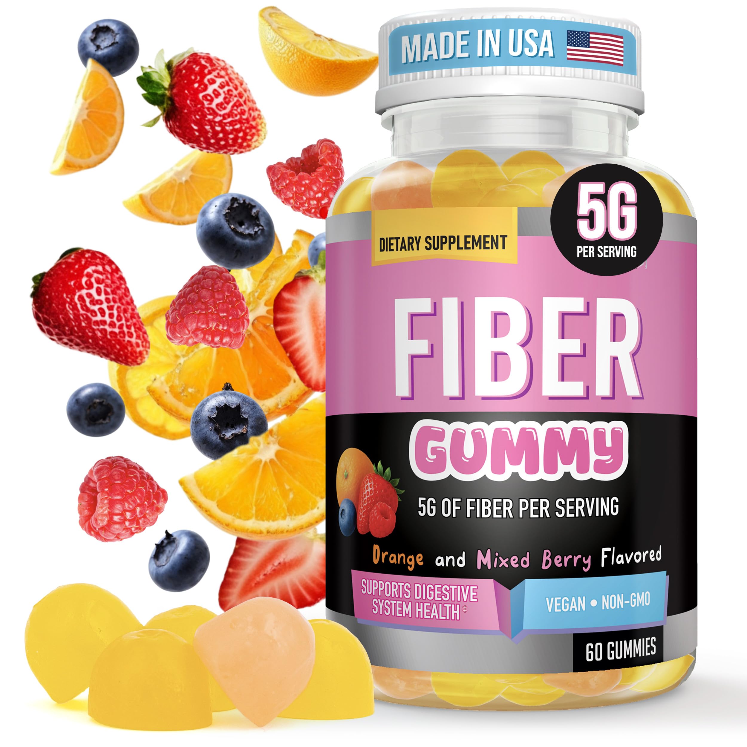 How to use: Chew 3 gummies daily, preferably with food, or as directed by a healthcare professional. Chew thoroughly before swallowing. Straightforward formula you can read: Pectin-based gummies colored with vegetable juice turmeric includes 3 g added sugars per serving. Tastes great, easy routine: These fiber chews for adults come in Orange Mixed Berry flavors with a smooth chew, making daily fiber simple and consistent. Prebiotic from chicory root (inulin): Nourishes beneficial gut bacteria to help maintain a balanced digestive ecosystem—no mixing or water needed. 5g prebiotic fiber per serving: Each 3-gummy serving provides 5 g dietary fiber (18 DV) from chicory root (inulin) to support everyday digestive health and regularity.
